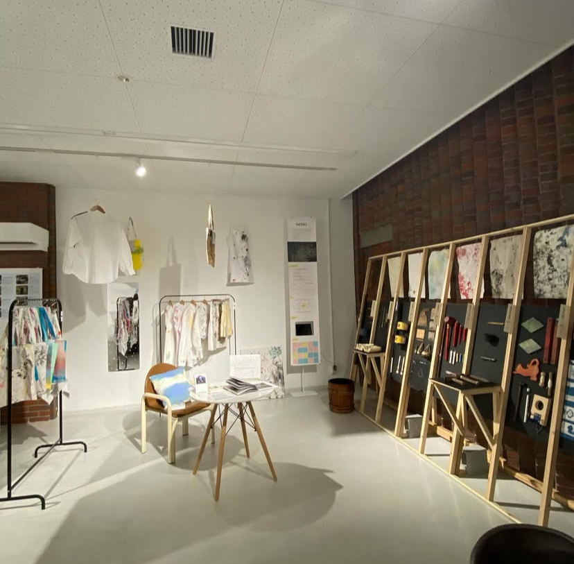 - 合計8人の職人さんにご協力いただいて、数ヶ月後にまた布を回収しに行って、完成したテキスタイルをモデルさんに着用してもらい、それぞれの工房で写真と映像を撮らせていただきました。 ただ布を汚したという印象にならないように、『nenki』というブランド名でタグもデザインしました。