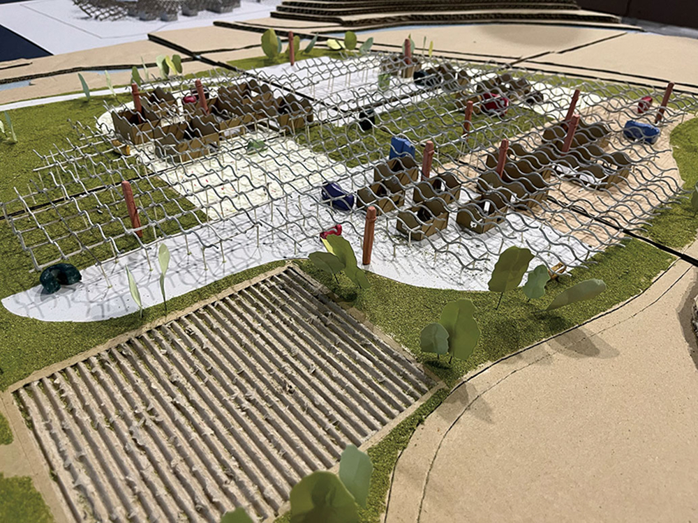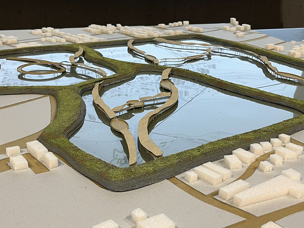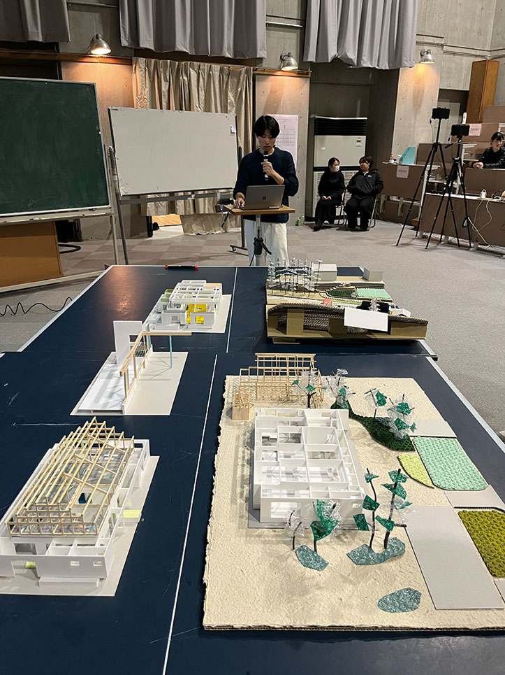 実際に団地を訪問し、実地調査を重ね設計を行う集合住宅課題。建築だけでなく、まちの立地を生かした広場・風景を提案するなど、分野を横断しながらチームで課題に取り組みます。