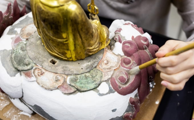寺社や地域に伝わる仏像や石造物などを実際に調査し、新たな歴史価値を発見します。また、古文書や絵画などを読解するスキルや、素材特性に応じた保存修復の技術を身につけます。