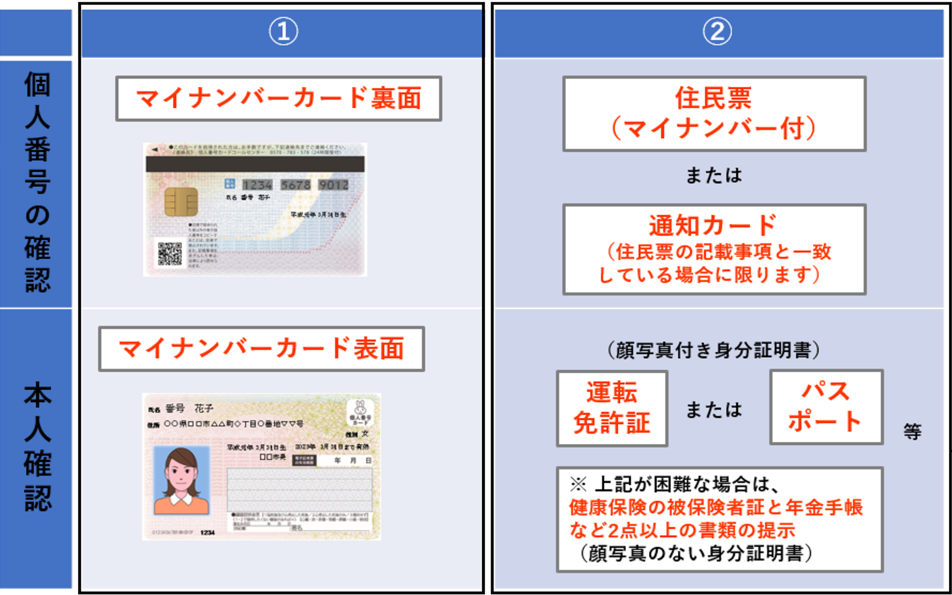 下記、指定書式「個人番号(マイナンバー)届出書」に自署、マイナンバーおよび身元証明が確認できる下図①または②の組み合わせで書類を貼付してください。