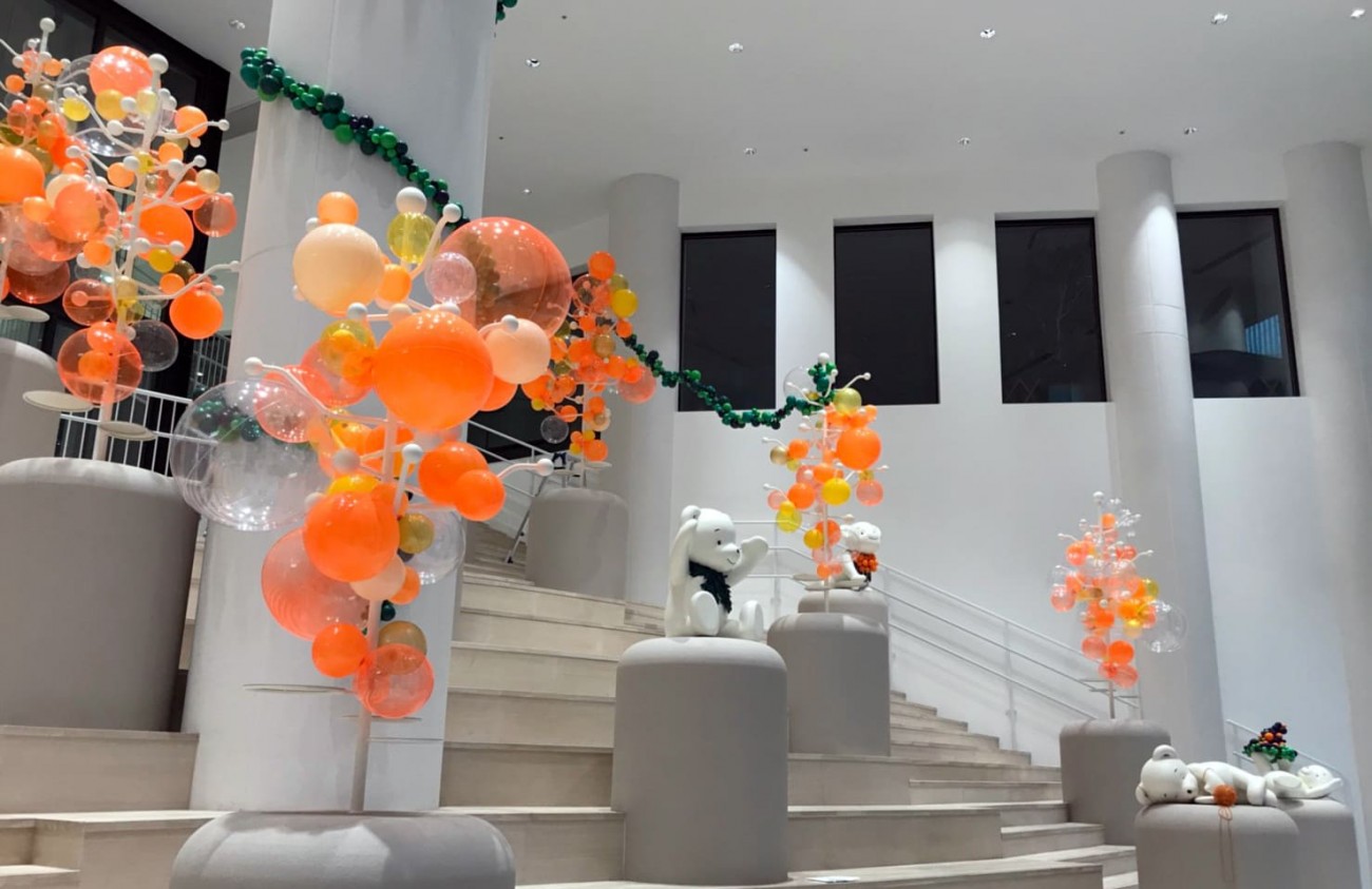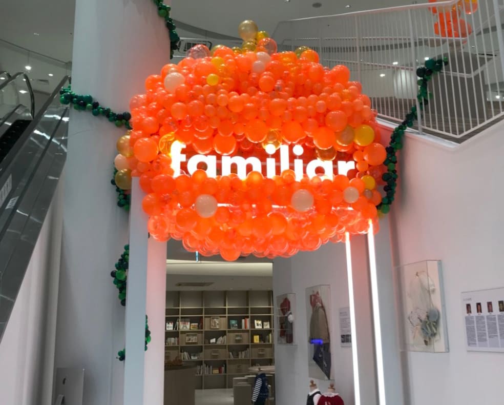彫刻家で京都造形芸術大学 大学院 芸術研究科教授の名和晃平先生によるULTRA SANDWICH PROJECTでは、2018年9月8日に新規オープンしたベビー・子ども服ブランド「ファミリア」神戸本店の店舗内装工事に携わりました。リサーチとアイデア出し、模型制作や作品設営など、2017年9月から約1年にわたり学生たちが奔走したこのプロジェクトでは、アートディレクターの八木保さんとのマテリアルボード制作、バルーンアートユニットの「デイジーバルーン(Daisy Balloon)」とのハロウィーン装飾などを中心に手掛け、お客さまを出迎えました。学生の活動成果は、販売フロアだけでなく、レストランやカフェでも実際にご覧いただけます。