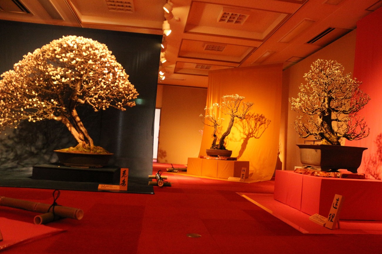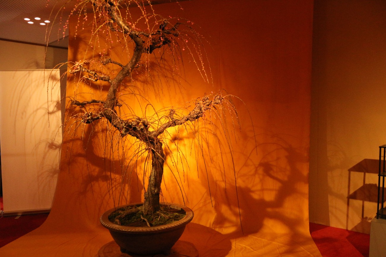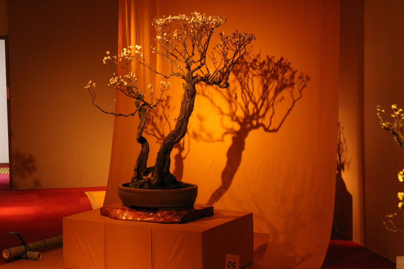 照明に照らされて、美しく浮かび上がる盆梅の陰影
