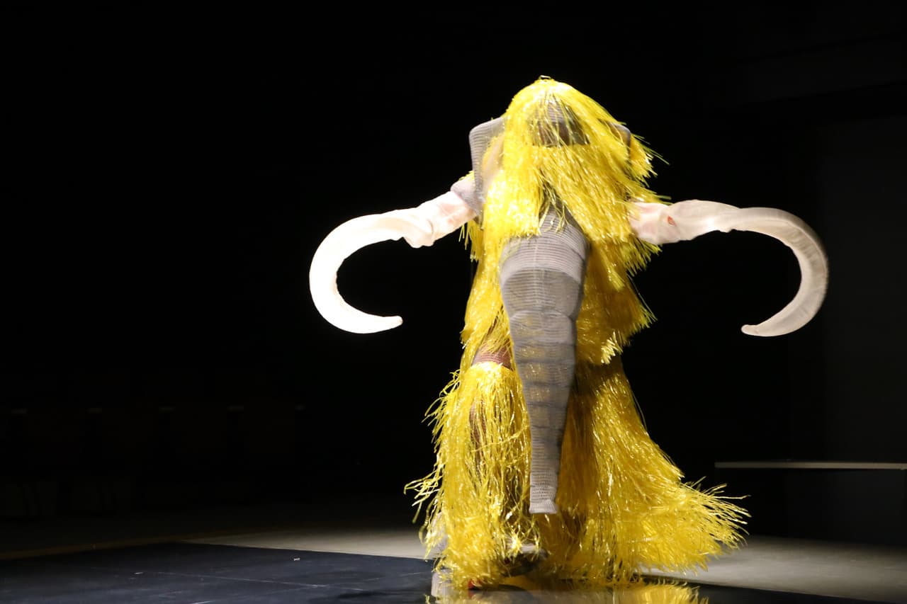 大昔に絶滅(ぜつめつ)したはずのマンモスが蘇(よみがえ)りおどりだす。ひびのこづえさんの衣装、川瀬浩介さんの音楽、そしてダンサーの藤村港平さんが繰り広げる、未来への希望に満ちたダンスパフォーマンス!