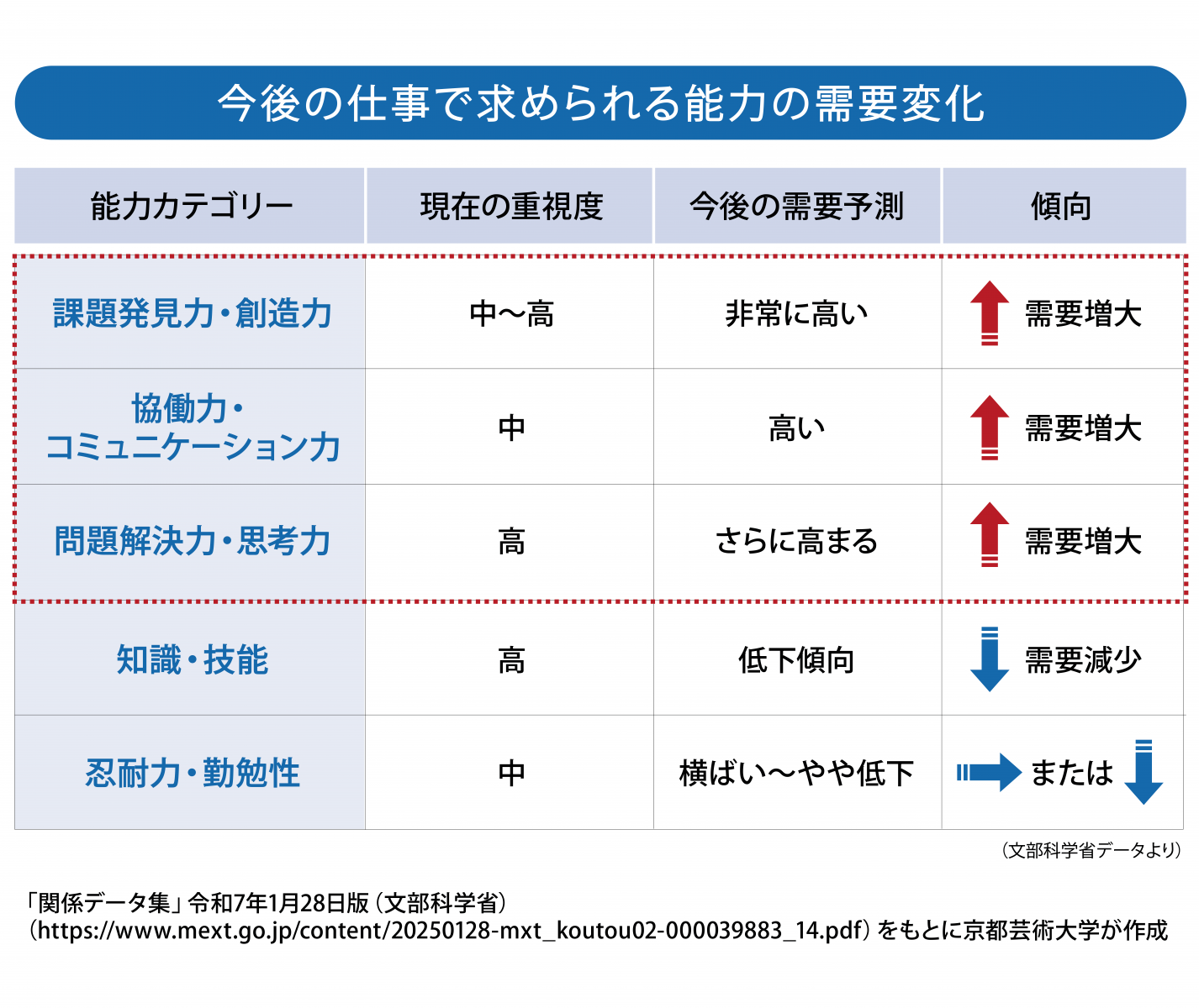 文部科学省が2025年1月に公表した「関係データ集(令和7年1月28日版)」によると、今後の仕事で求められる能力は、“知識”や“技能”よりも、「課題発見力」「創造力」「協働力」などの探究的スキルの需要が高まると予測されています。特に、社会全体で「自ら課題を見つけ、考え、他者と協働して解決に導く力」へのニーズが顕著に上昇しており、教育現場でも“知識を問う”から“問いを立てる”学びへの転換が進行しています。