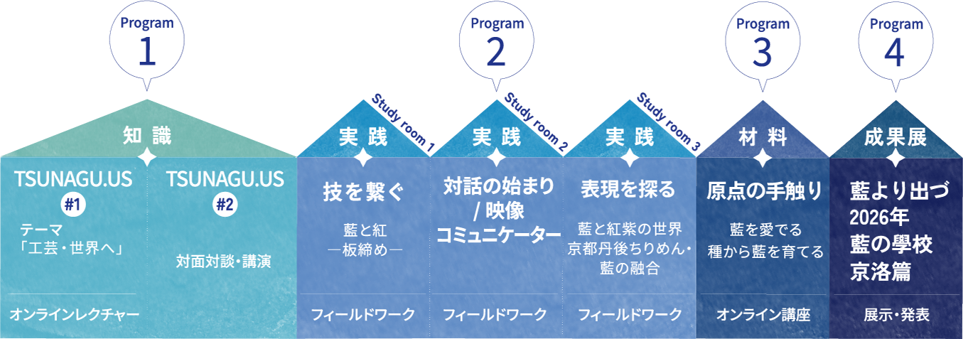 「藍の學校」は、知識を身に付け、実践を通して技術を学び、作品を制作するという4つのプログラムで構成されています。技術向上に加え、考えを形にする構築力と行動力の習得を目指します。