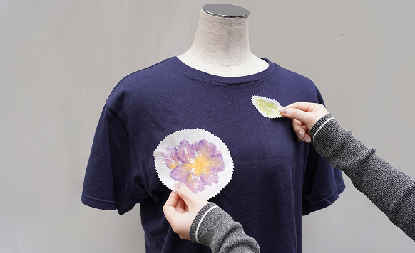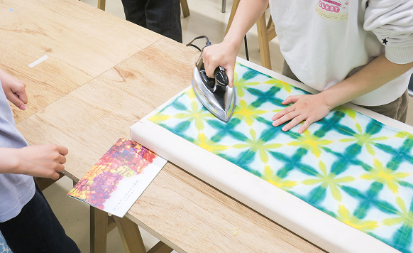 染織の産地の1つ、愛知県 有松の「雪花絞り」は、布の折り方で柄が変わる楽しさがあります。今回は、畳み方を工夫して模様を作りながら、「デザインの仕組み」を学びましょう。布を広げた瞬間、万華鏡のような絵柄が現れる感動を体験!模様を組み立てる面白さこそ、テキスタイルデザインの第1歩です。