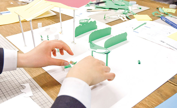 デザインはつくるだけでなく、アイデアを考えることも大切。今回はわがまちの魅力を紹介できる場所に、自然を育てたり、まちの人と交流しながら、よりよいまちづくりに繋げるコミュニケーションパークをつくります。「自分の視点」のアイデアを生み出し、みんなの「共感」を得ること、それがデザインの第1歩です。
