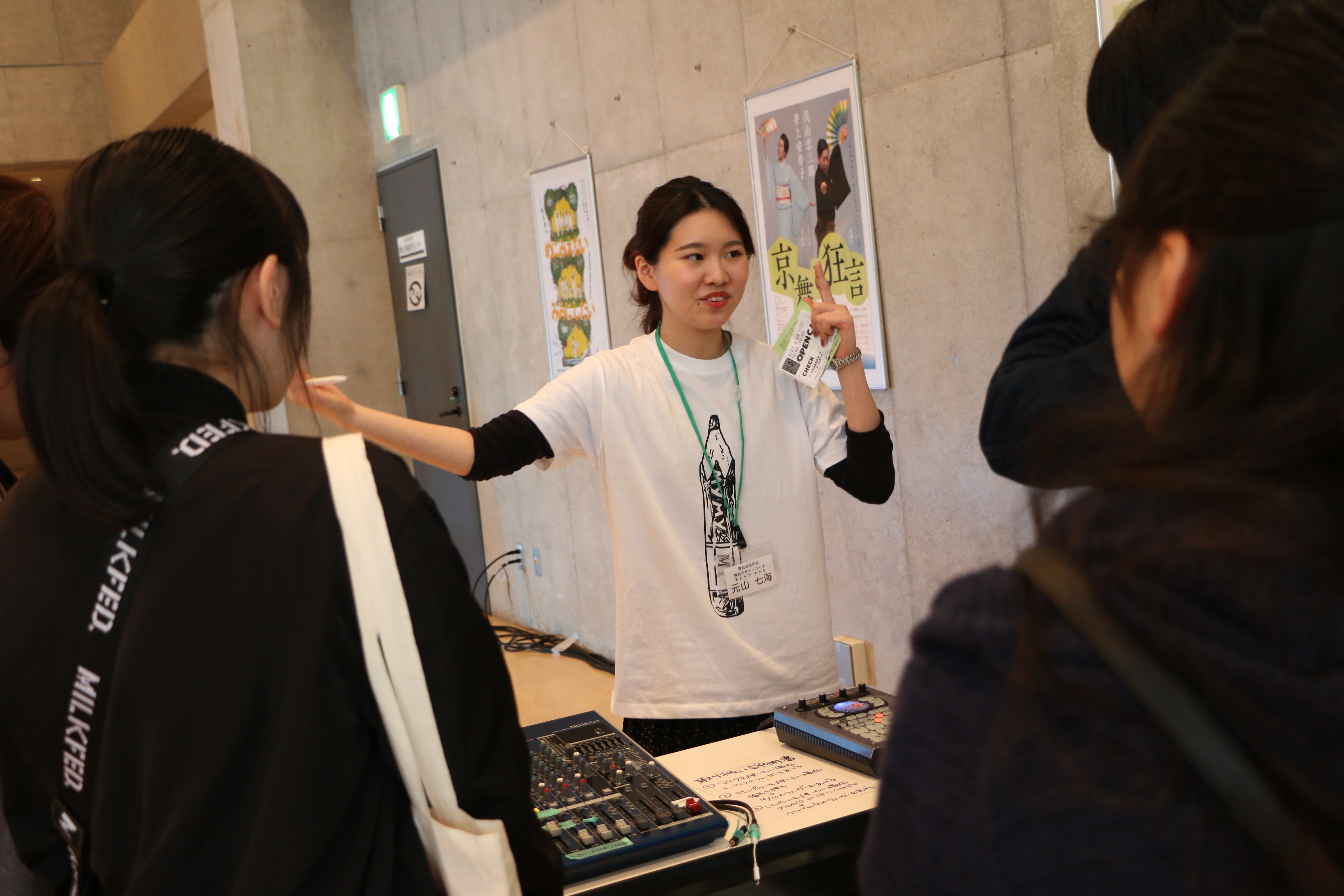 音響の操作卓を触ってスピーカーから音楽を流したり、照明の操作