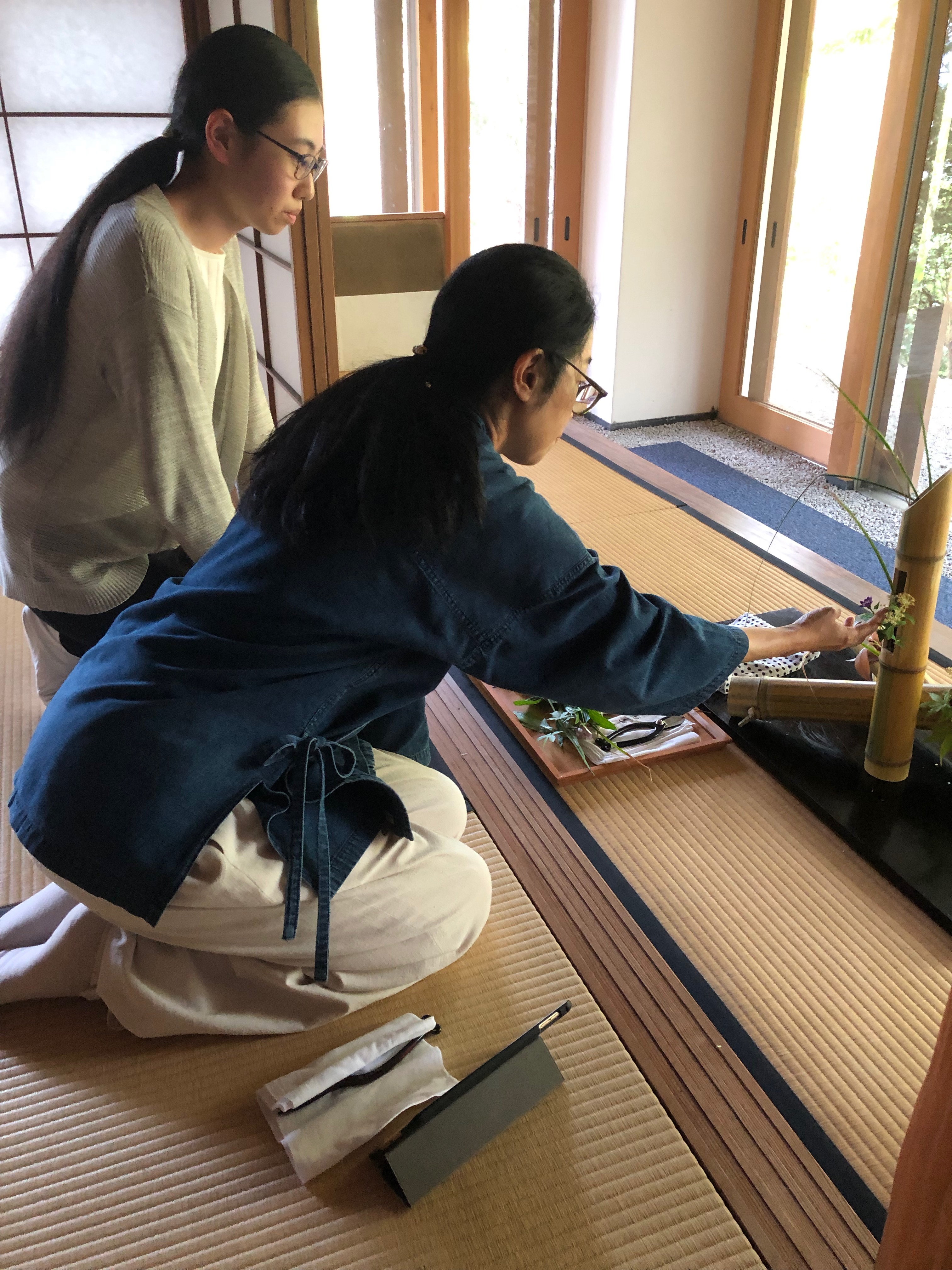 1年生は珠寳先生の立花の授業。立花の基本だけでなく、礼儀や立ち居振る舞いや所作も学びました。滋賀県の蓬莱の竹林まで材料を自分たちで取りに行き、その竹を使用して花入を手作りしました。杜若を観察するために水生植物を専門に扱う杜若園芸さんを訪れたりもしました。最後の課題は自分が作った花入に花を生けて、プレゼンテーションをします。