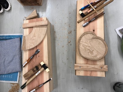3年生は一年前に自分で彫ったお盆に漆を塗る作業を行いました。先生が準備してくださったお椀にも漆の塗りを施します。