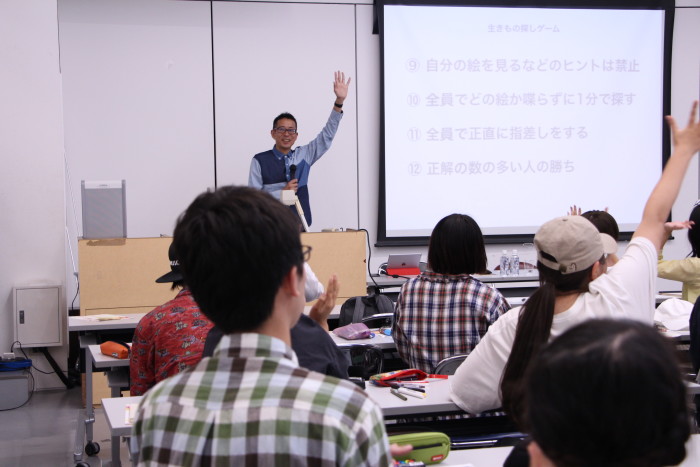 特別講義の中で、子ども達に、わかりやすく考え、議論することを教えるために、さまざまなゲームを実践している、というお話がありました。例えば、みんなで、動物の名前が書かれたカードを引き、動物の絵を描く。それを各々で壁面に貼り、自分が描いた絵について、使った色や形、特徴などを相手に話す。話を聞いた人は、その絵がどれかを当てればポイントが入るというもの。これは、相手に伝える、というプレゼンの初めの第一歩の練習につながります。