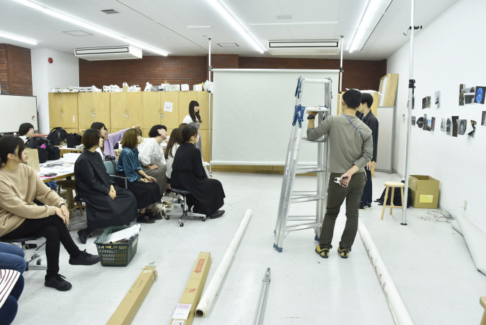 前期から続くこの授業は、空間デザイン分野の表現技術を伴う領域を、木曜日に年間を通じて学びます。