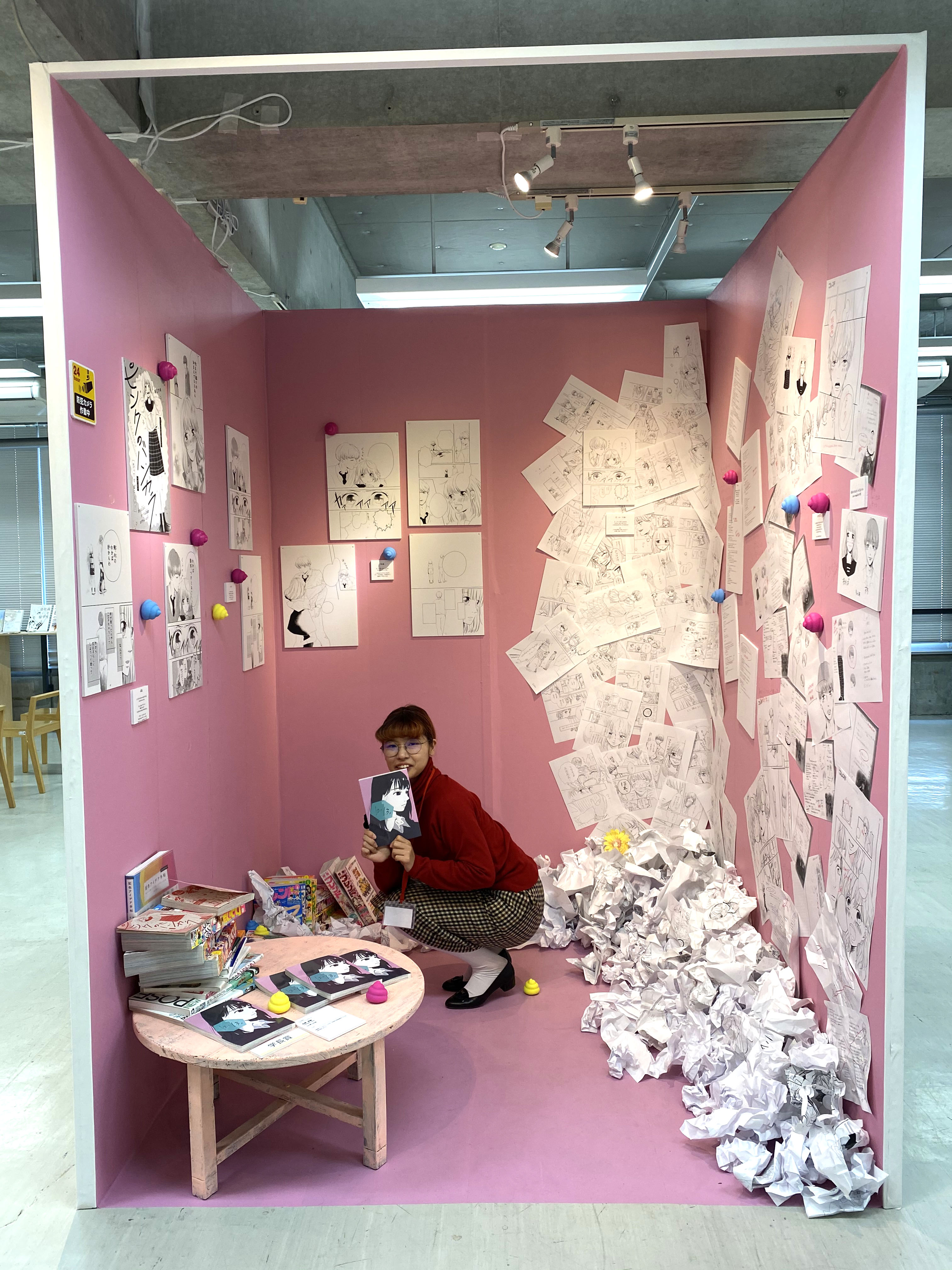 展示については、ピンクの背景でちゃぶ台を囲うように設置された壁は石原さんの脳内を表していて、