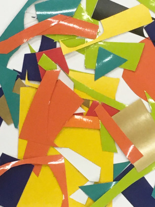 作業上、どうしても余ってしまうカッティングシートの端材を学生たちが看板屋さんからいただいてきたので、今回はこれを素材にかおあそびをしながら、ポストカードを制作します。