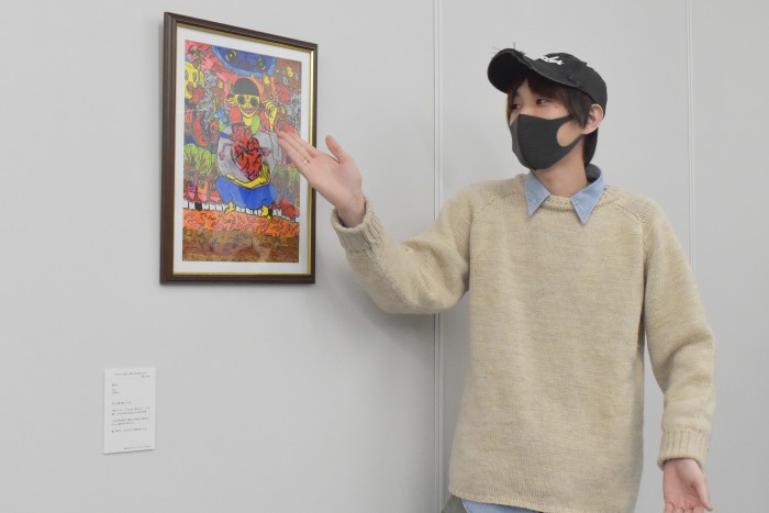 作品解説をする大竹 真心君(大阪府立池田高等学校出身)