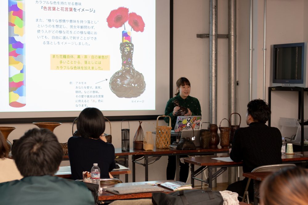 竹を素材に様々な商品を展開する公長斎小菅。なかでも花かごは最も大切にしたいアイテムの一つとされています。公長斎小菅の創作理念の一つは「古典と現代の融合」。そんなものづくりの姿勢や、企業努力をリサーチし、新たな商品の提案、そして、採用を目指しました。今回の構想は、おとし。おとしとは、竹かごの中に花を生けるために置く花入れ(通常は竹筒)のことです。会社に出向き、様々な花かごを見学し、そこで選んだ花かごのおとしを構想し、副社長の小菅達之様にプレゼンテーションしました。総合造形コースで学ぶ学生ならではの発想で提案しました。