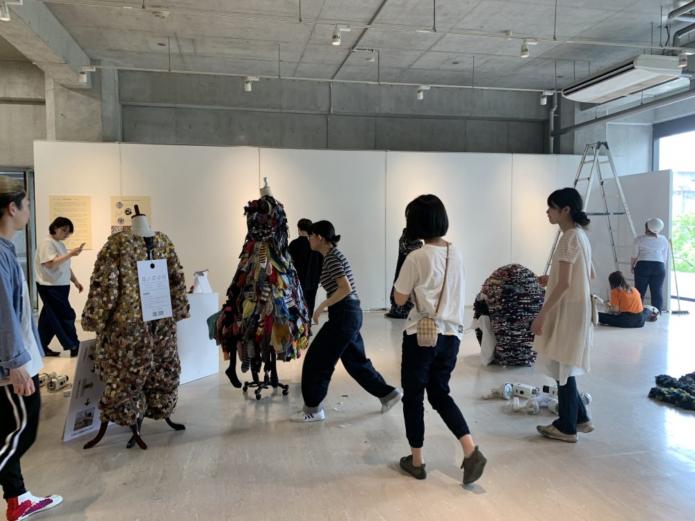 Tabioブランドの靴下で「タビオ株式会社」を迎えての産学連携授業です。タビオ株式会社のサスティナブルな商品製造の取り組みのレクチャーや靴下の工場見学から始まり、SDGs(2030年までに持続可能でよりよい世界を目指す国際目標)を考え、リサーチしていきました。靴下の縫製工程で廃棄されるリング状のハギレを素材とし「タク タイル(触覚)」「サスティナブル」という2つの視点から作品制作を行い、展覧会を企画、実施しました。