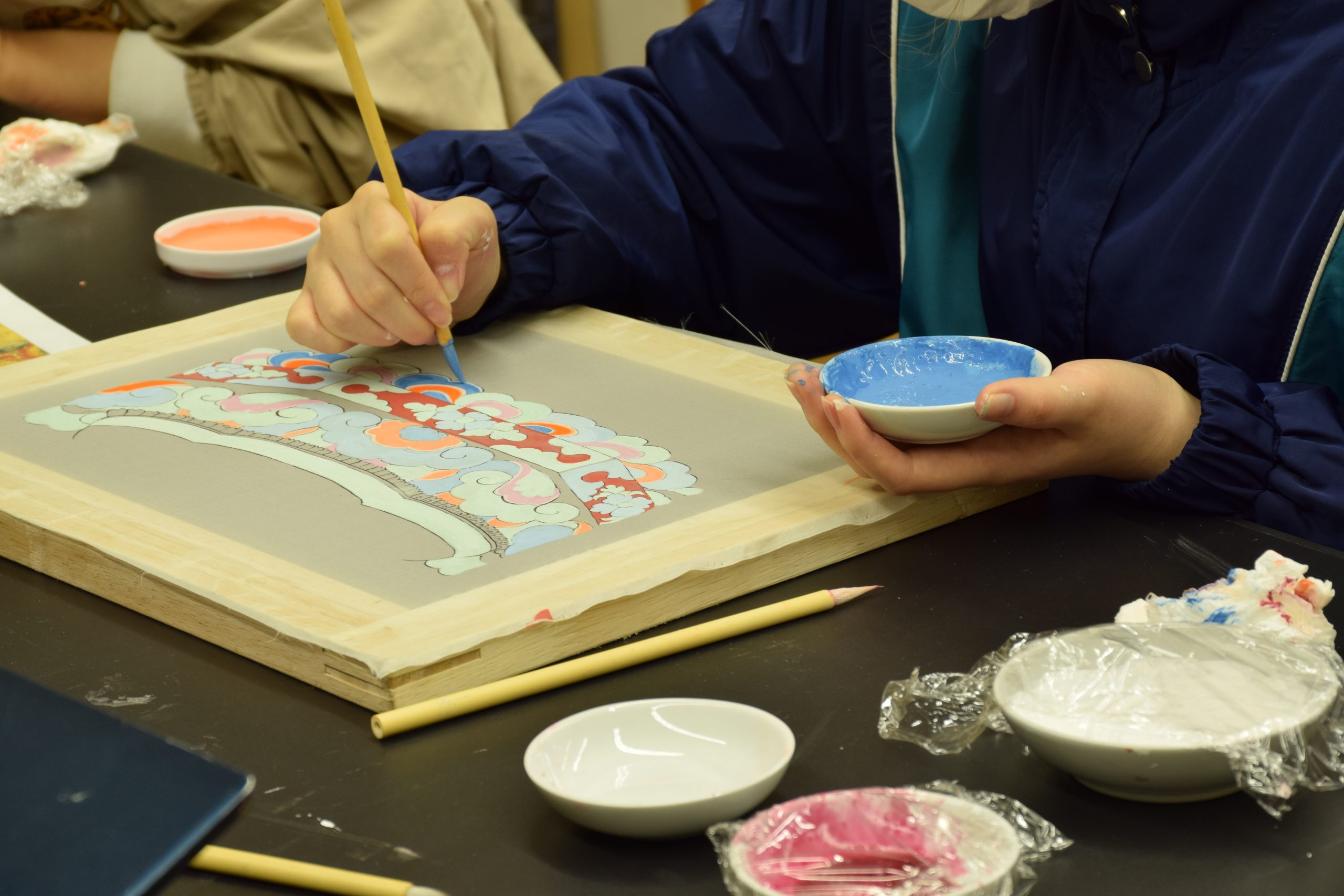 Aクラス:保存修復の基礎と文化財科学(増渕先生・山田先生)では、奈良国立博物館収蔵「国宝絹本着色十一面観音像」の台座部分の繧繝彩色を再現します。