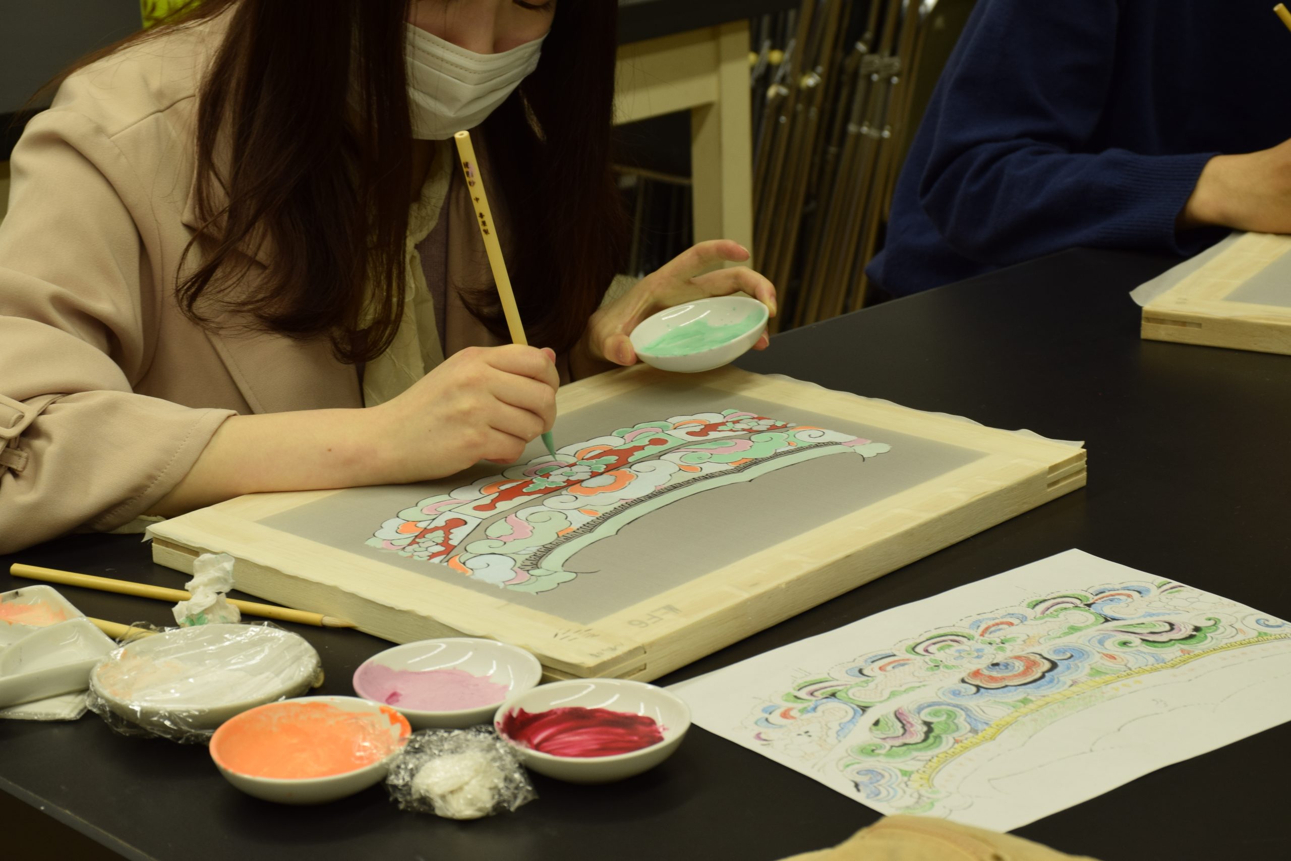 繧繝彩色は、同色で薄い色から濃い色へと段層的に濃淡をつける彩色方法。使用するのは天然の顔料です。人工の有機顔料とは全く違う発色、扱い方の違いを学びつつ、木枠に張った絵絹に、実際に彩色していきます。