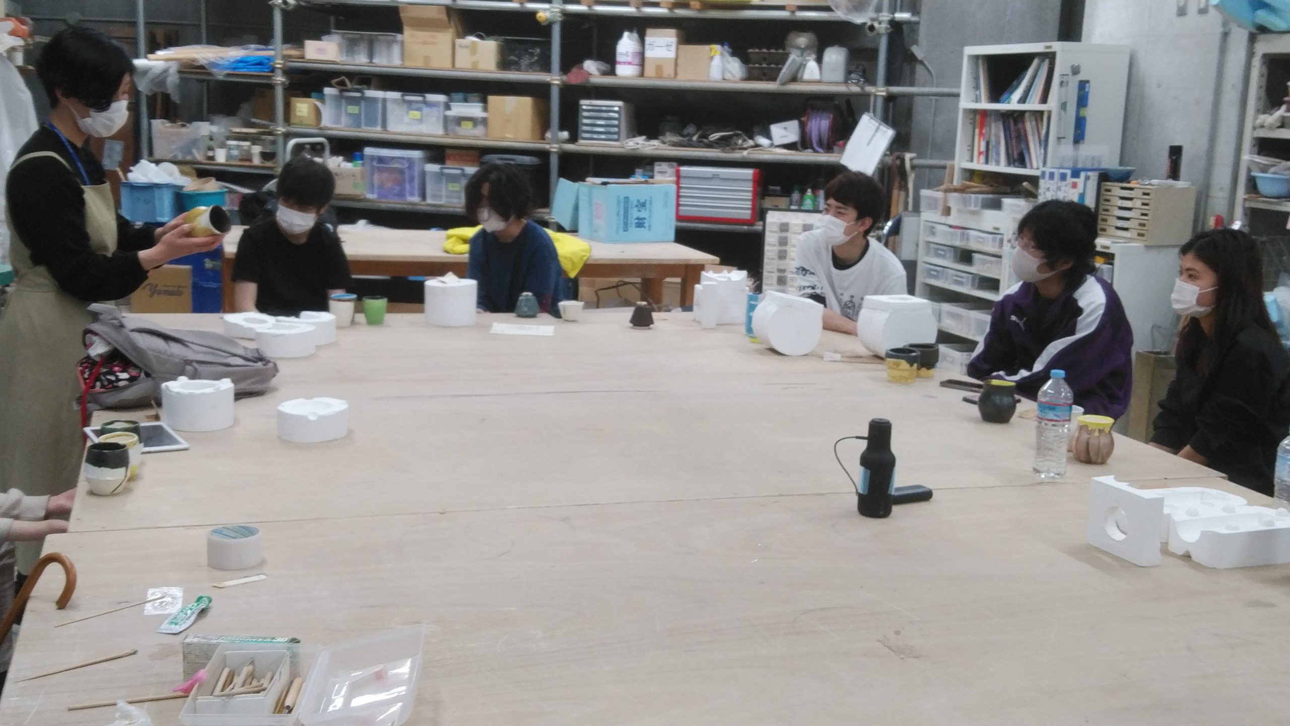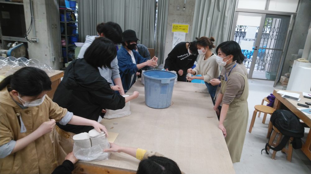石膏でコップの原型を制作し、石膏原型から鋳込み型を取り、型の中に泥漿(でいしょう)を流し込んで成形するといった課題です。