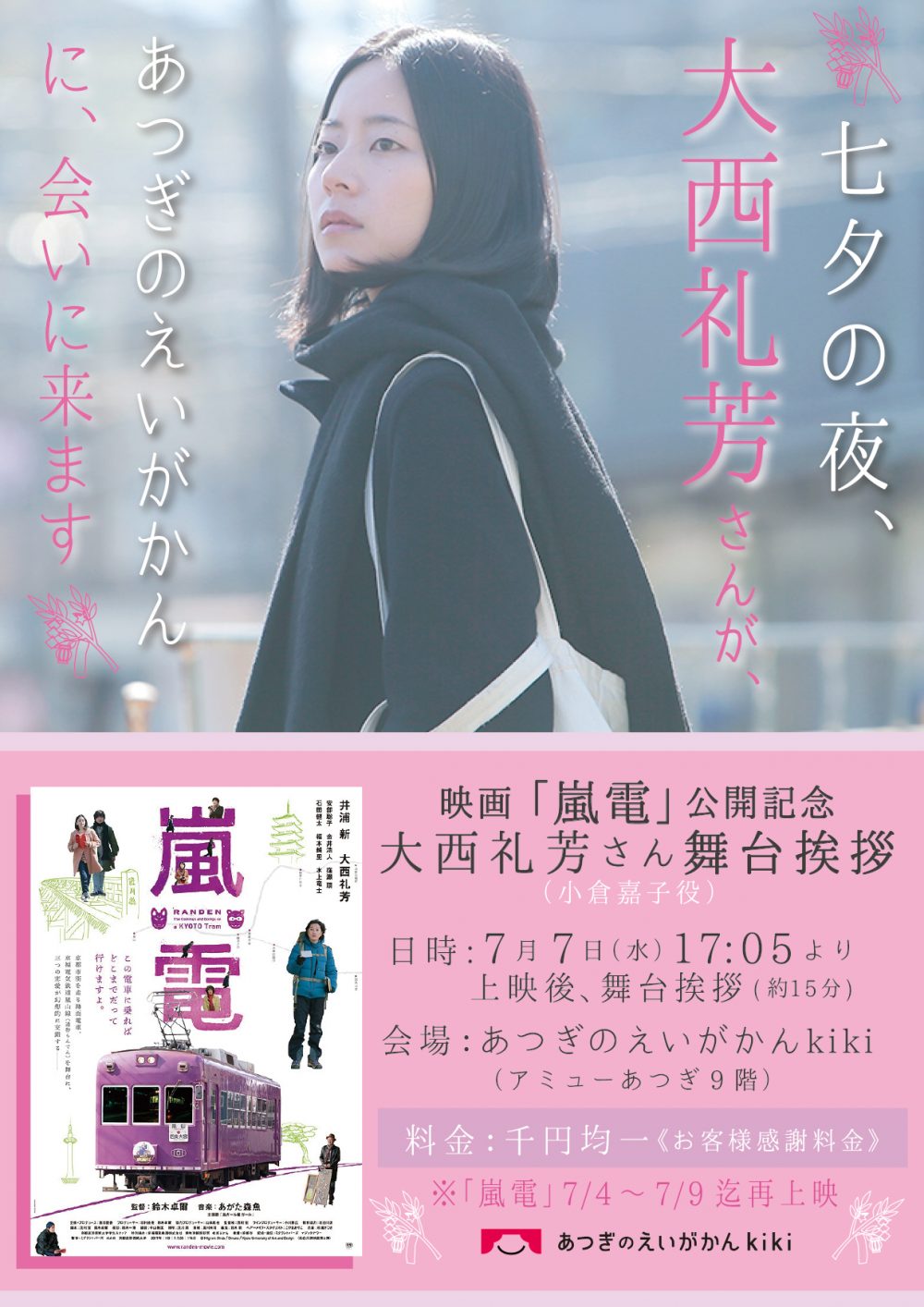 この上映は「See You at Theater~映画館で会いましょう」の中で、『嵐電』に出演した大西礼芳さん(3期生・「トライストーン・エンタテイメント」所属)が「あつぎのえいがかんkiki」を紹介したことが契機となりました。