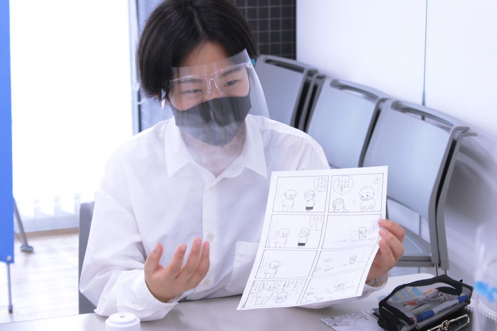 体験授業では、マンガの1シーンをみて、登場人物や背景、効果の描写がどんな意図で描かれているのか考察します。