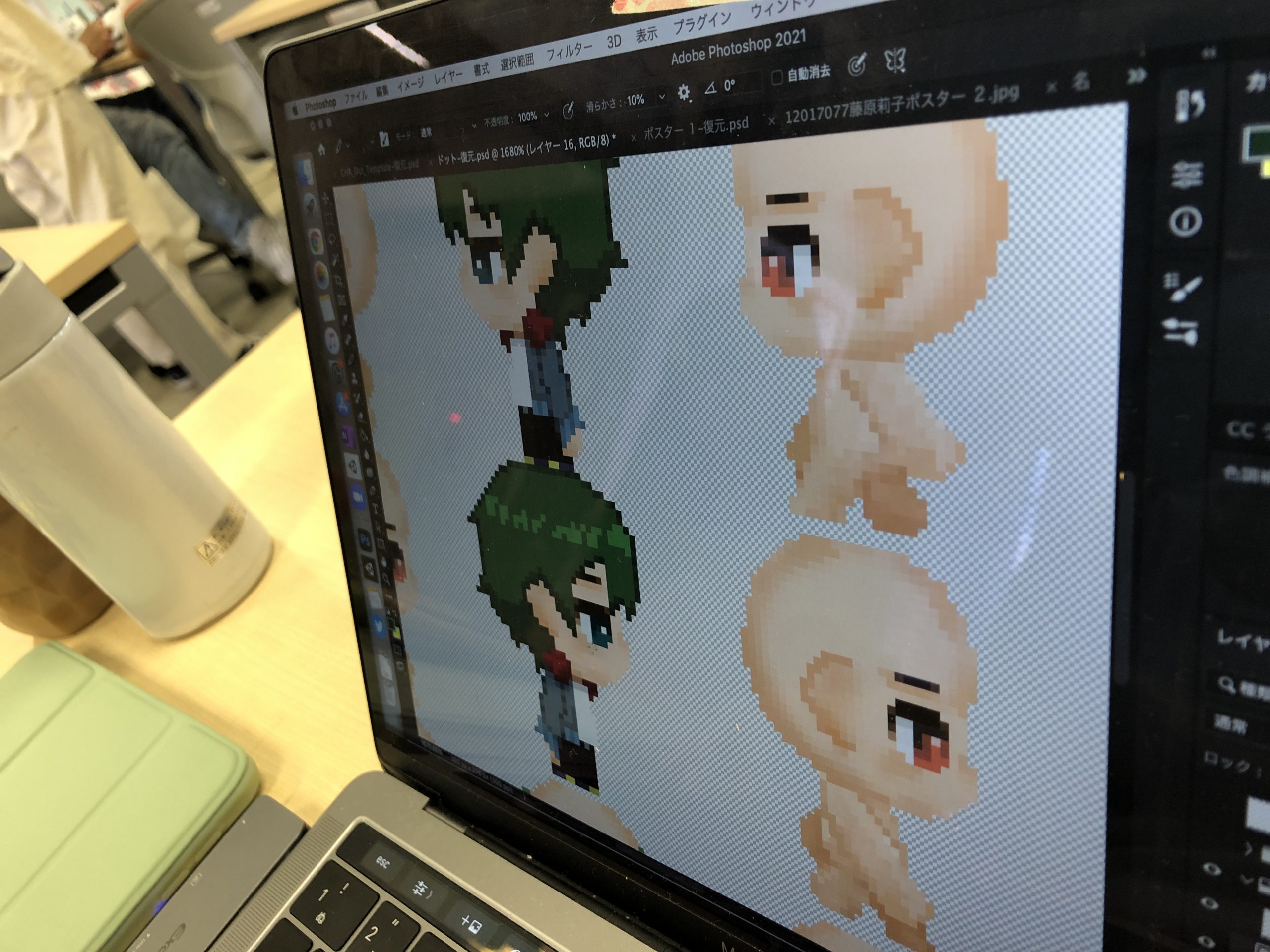 デザインチームのリーダー藤原莉子が朦朧とする意識の中、キャラクターの立ち絵をベースにひたすらドットを打っている。