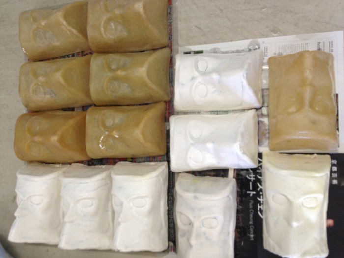この型に布などを何層も塗り重ねてマスクを成型します。