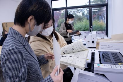 中身のマンガ・表紙の絵やデザインはもちろんのこと、学科にあるプリンターや製本機を実際に使用して、どのように本ができあがっていくのかを学びます。本日は製本時の様子をお伝えしていきます!