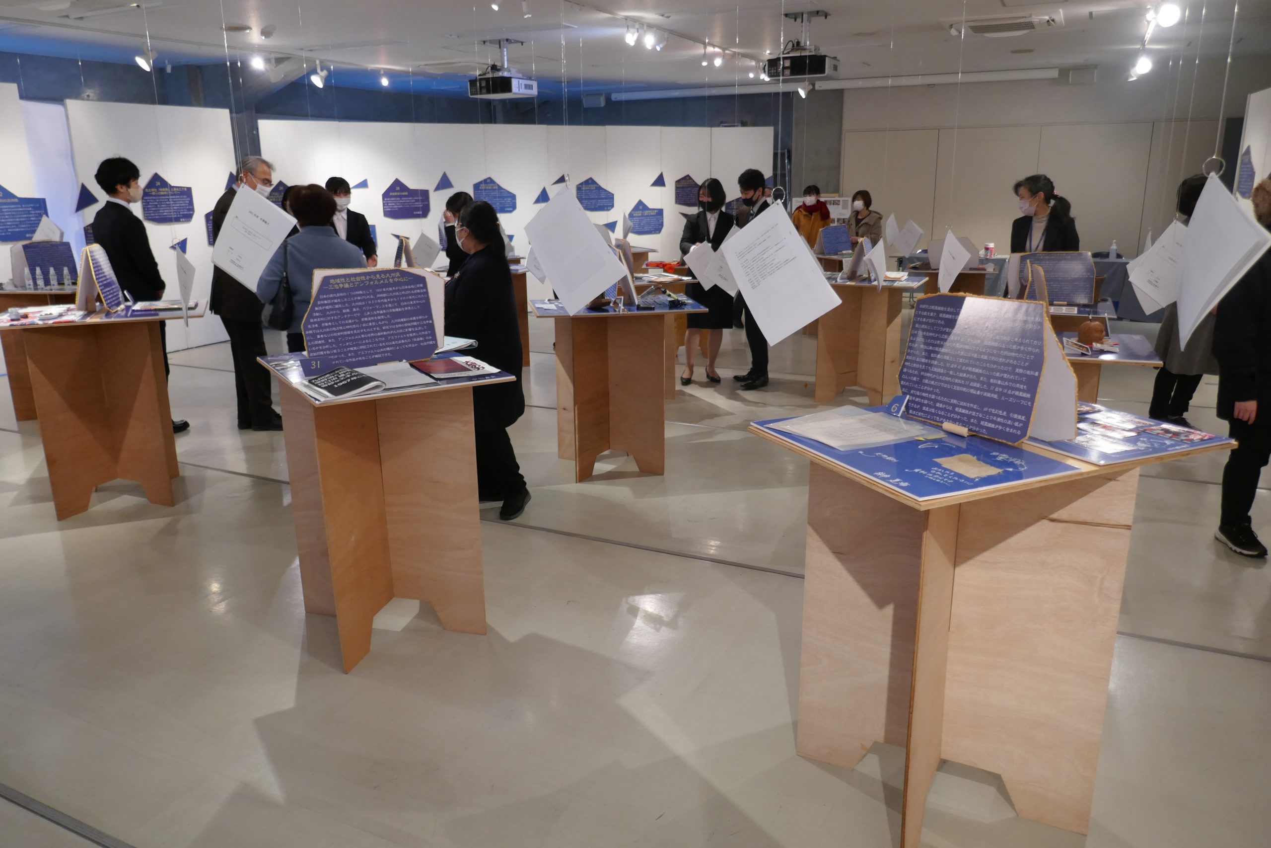 展示は35名の論文要約パネルを金継ぎのカケラに見立て、それが奥に集中し、「歴史遺産」に積み重なり厚くなるイメージです。