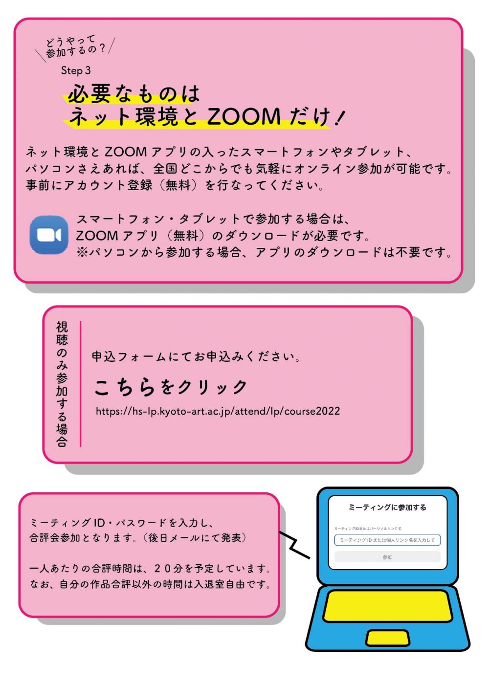 ・オンライン合評会に取り上げることが決まった作品については、合評前に参加者の皆様(視聴のみ参加される高校生の皆様も含む)にデータ共有させていただきます。参加方法などの詳細を学科から応募者様宛にメールで連絡いたします。