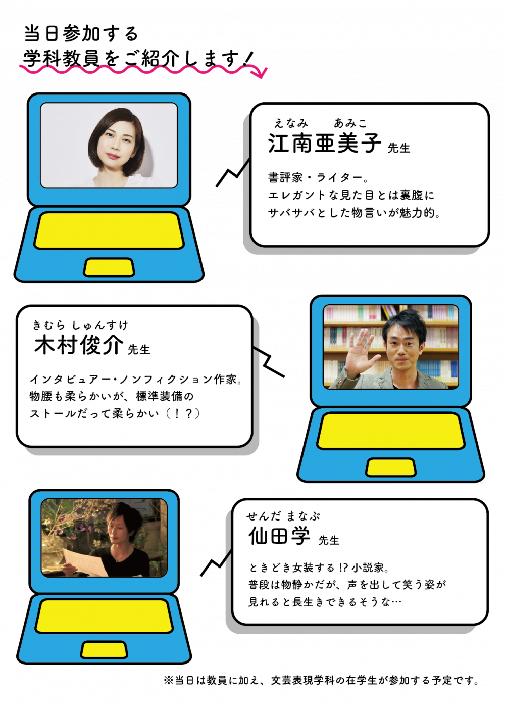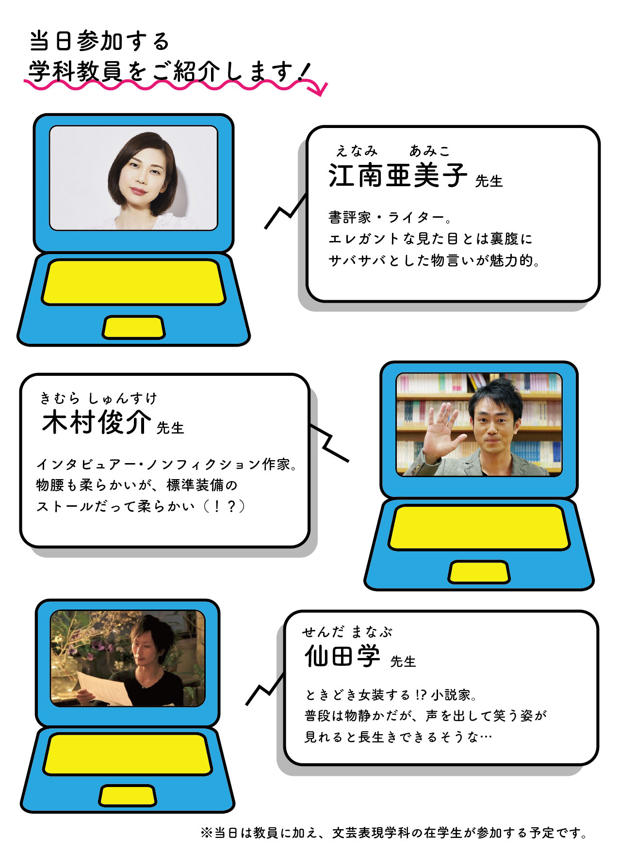 当イベントは学科内でも定期的に開催される「合評会」の雰囲気を味わっていただくため、高校生、受験生の皆さんにオリジナル小説を執筆していただき、その作品を学科教員・在学生が読み、批評やアドバイスを行うというものです。