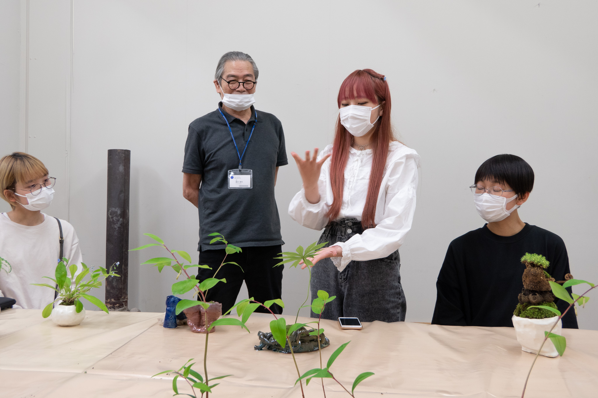 学生の作品の自由な世界観を尊重しながら、生けられている植物の葉・茎の長さや植物の動きが花器と