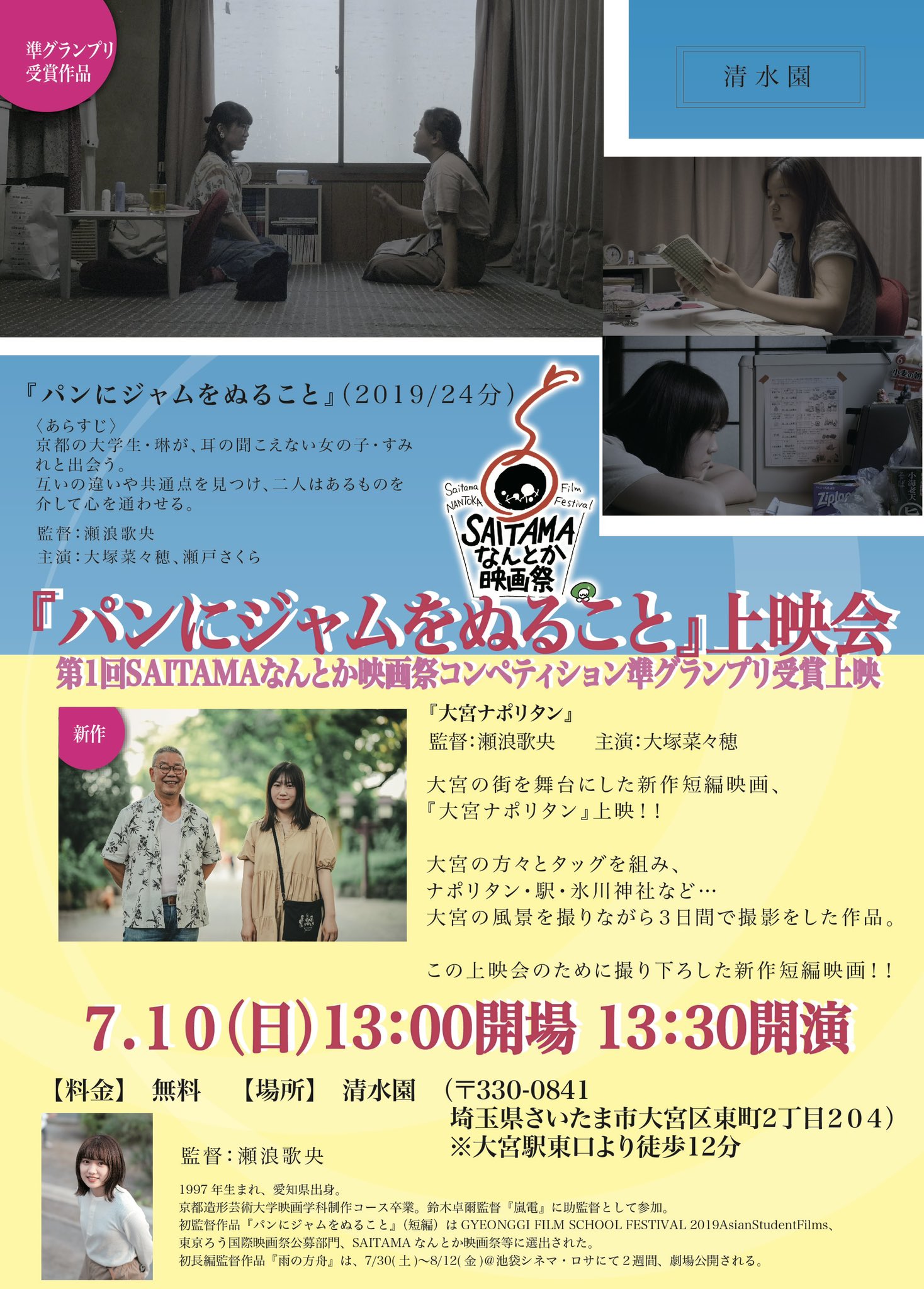 明日(7/10)、瀬浪歌央さんと大塚菜々穂さんたちがつくった、映画『パンにジャムをぬること』が大宮の清水園で上映されます!