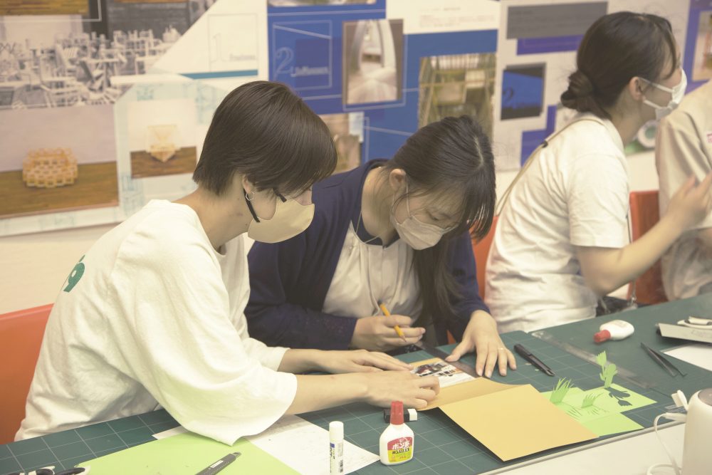 学生の作品を参考に人の添景をつくったり、在学生からアイデアの出し方や図面の描き方等のアドバイスをしてもらいながら椅子の設計をしていました。このワークショップで少しでも環境デザイン学科の面白さに気付けたのではないかと思います。