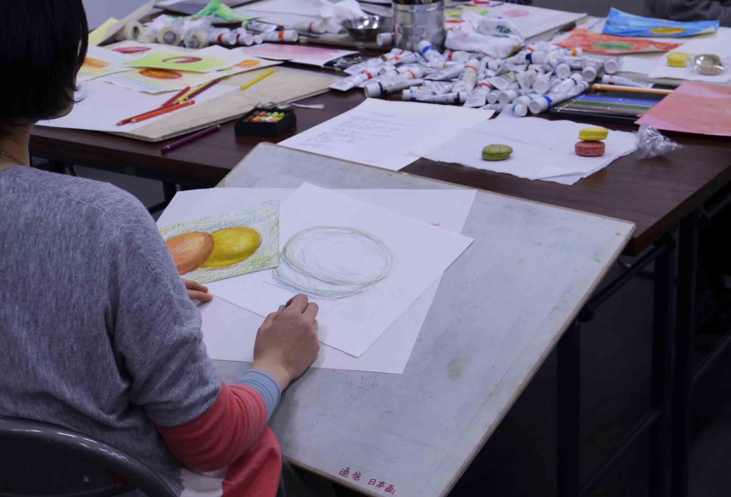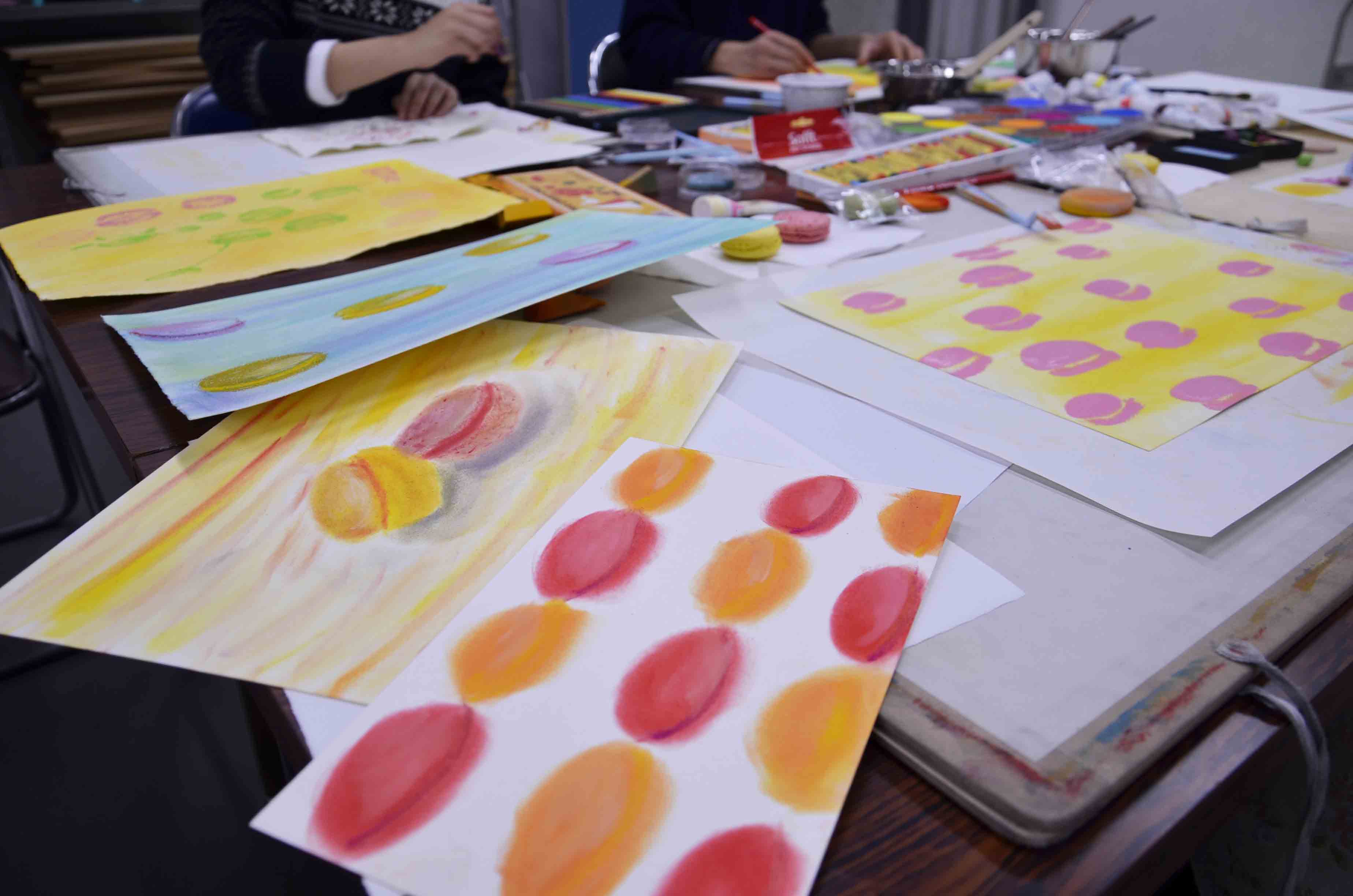 第一回目の今回は、油画コースの奥田輝芳教授が担当。パステルでマカロンを描きました。