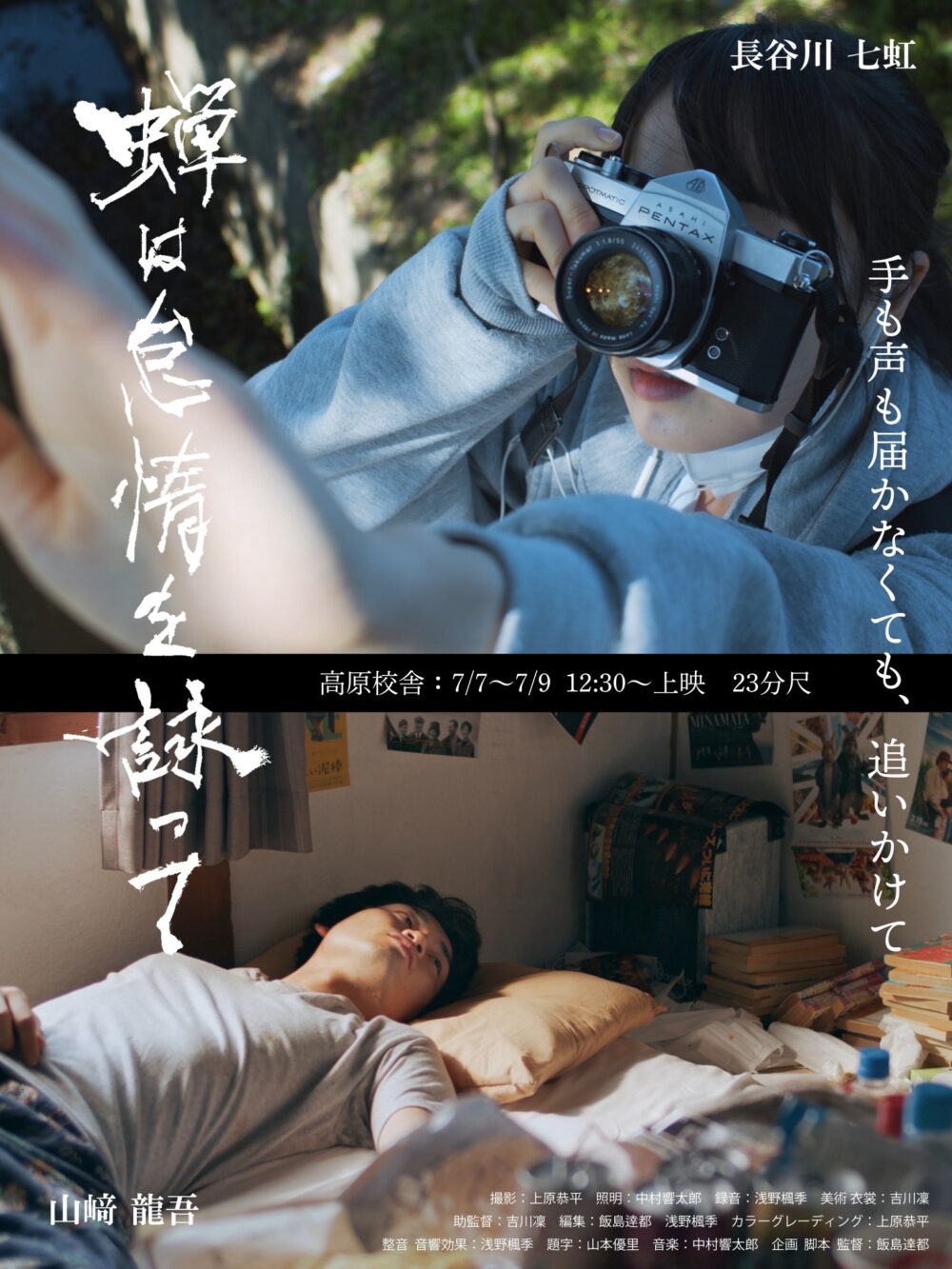 四回生の飯島達都さんが監督し、四回生俳優コースの長谷川七虹さんと山﨑龍吾さんが出演した自主制作映画『蝉は怠惰を詠って』が完成しました!7/7(金)〜7/9(日)の三日間、12時30分より高原校舎・試写室にて上映会が行われます。