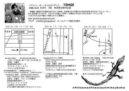 さて、先日のBゼミ時間に、こども芸術学科1期卒業生の塩入友恵さんがひょっこり訪ねてくれました。なんと卒業してから2年ぶりの訪問です。大学近くのgallery & cafe「万朶花(ばんだのはな)」で、個展が始まったので、DMを持って知らせに来てくれたのでした。