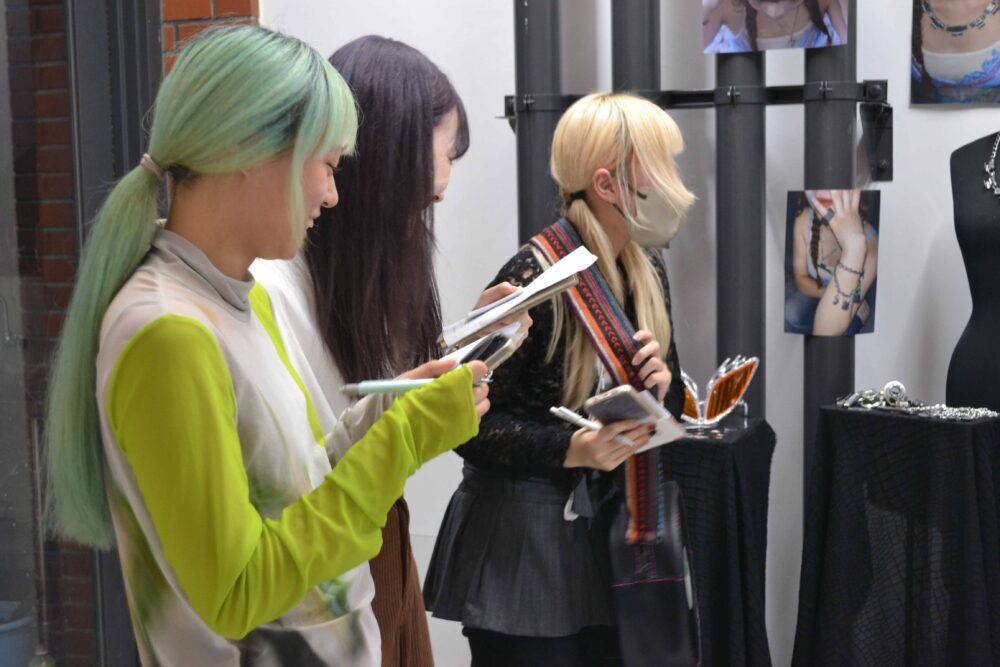 ファッションデザインコース2回生の学生も一緒に、講評を聞いて回りました。