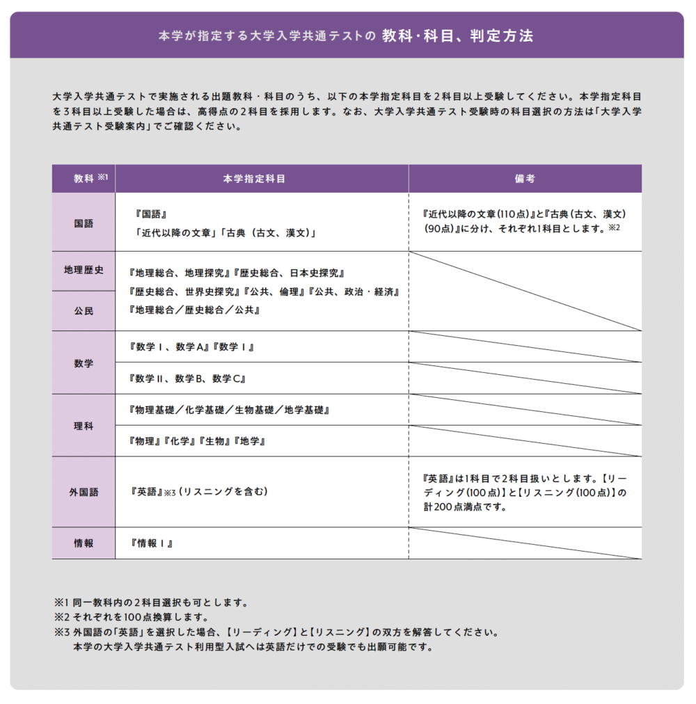 大学入学共通テストで実施される出題教科・科目のうち、以下の本学指定科目を2科目以上受験してください。