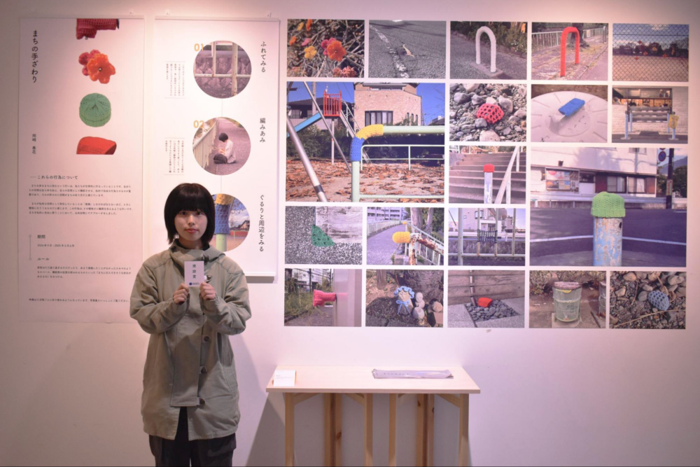 まち中で編んでいる時に、何人かの方々にいつも通る時に見ています、撫でていますといった声をかけていただきました。わたしのまち中にある編み物が、まちに住んでいる方々に受け入れてもらえることで、自分以外の方たちとまちを私的に自由に使う感覚を持てたと感じとても嬉しいです。また木の枝先に花を編んだ作品では、後に誰か付け足してくださったお花がありました。まち中で編むという一例の行為の他にこういった行為を見かけることができるといいなと思います。