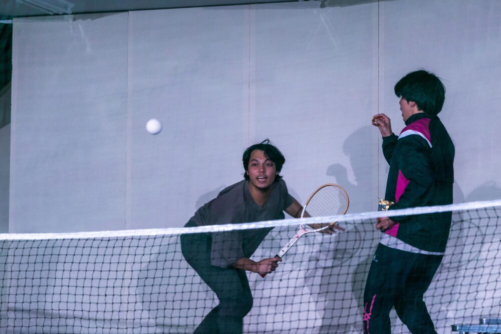 舞台上のテニスコートでテニスをしたり、他愛のない会話を楽しむ学生たち。
