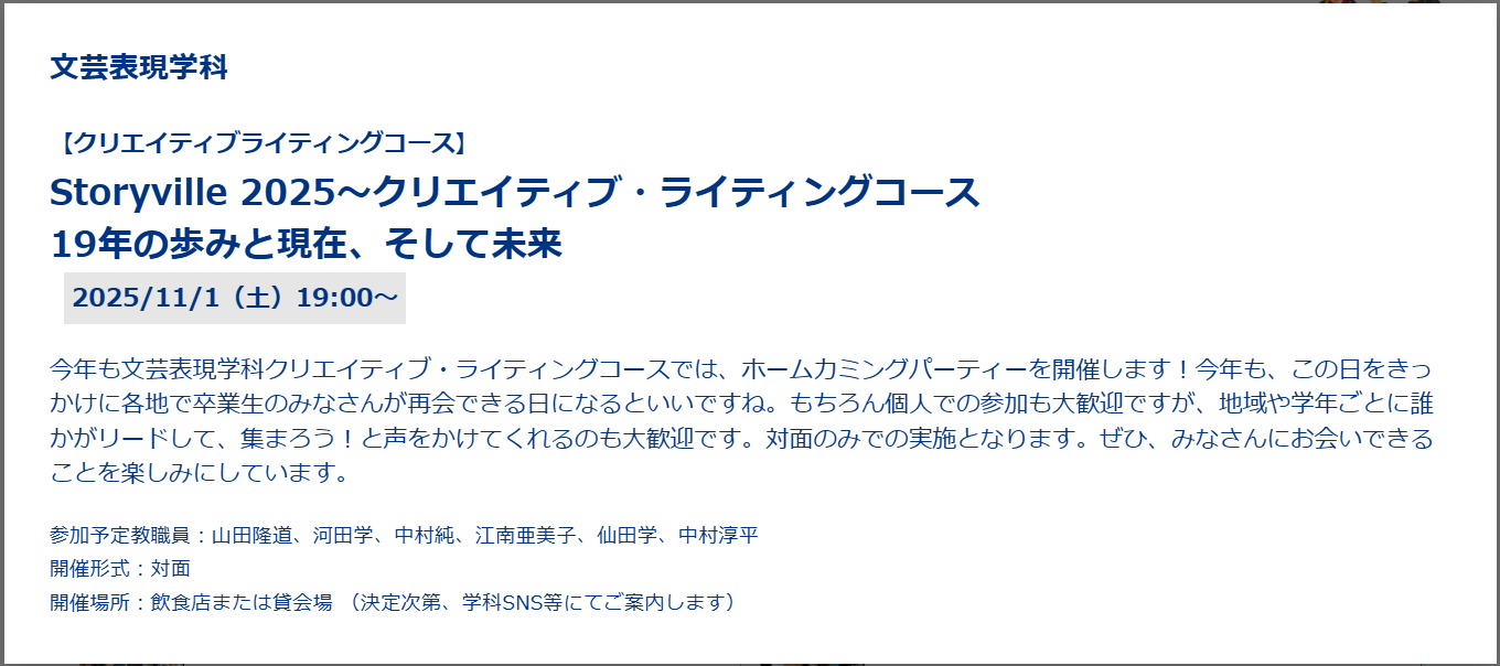 ②学科別ホームカミング・パーティー(学科別で実施する対面の懇親会)