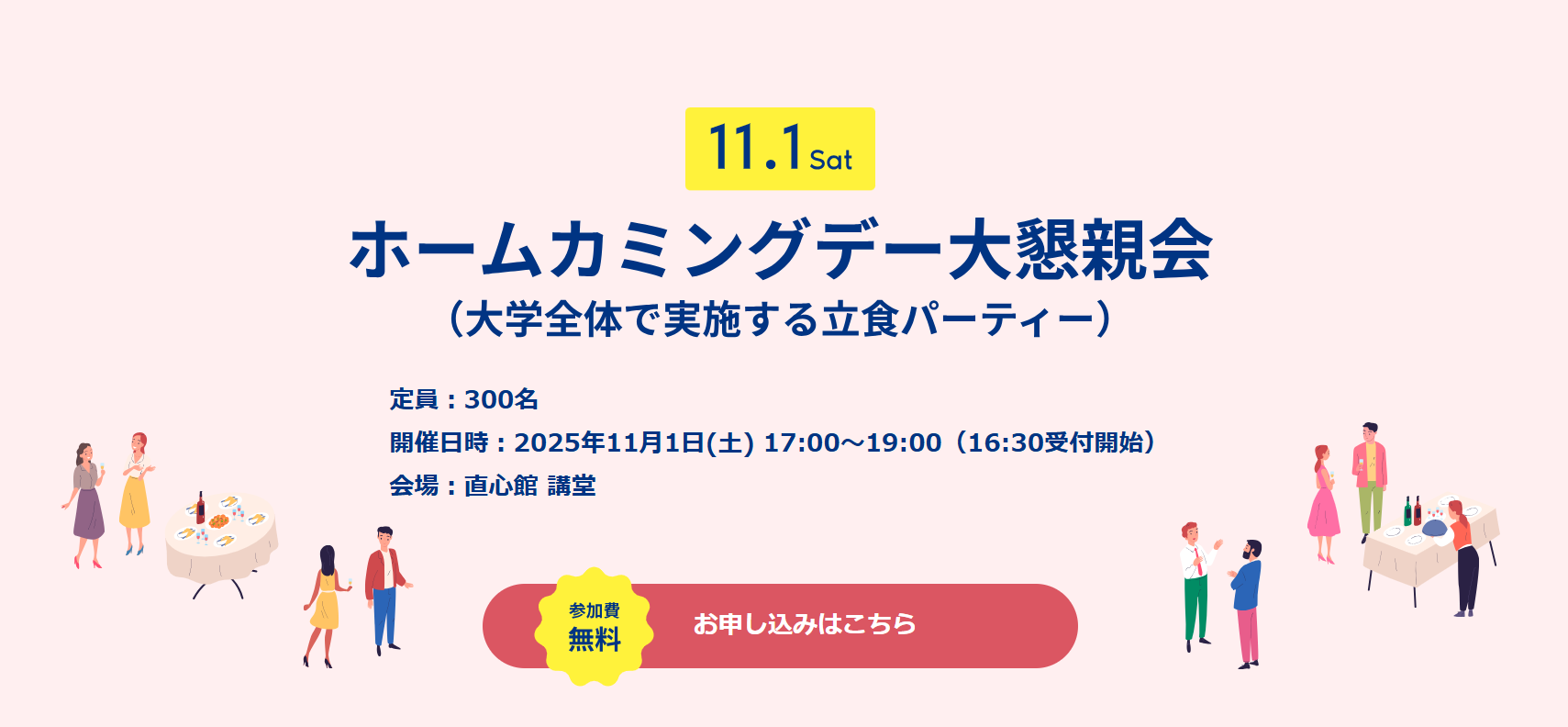 申込み:上記画像をクリック、または、特設サイト内「①ホームカミングデー懇親会」申込みフォームよりお申込みください。