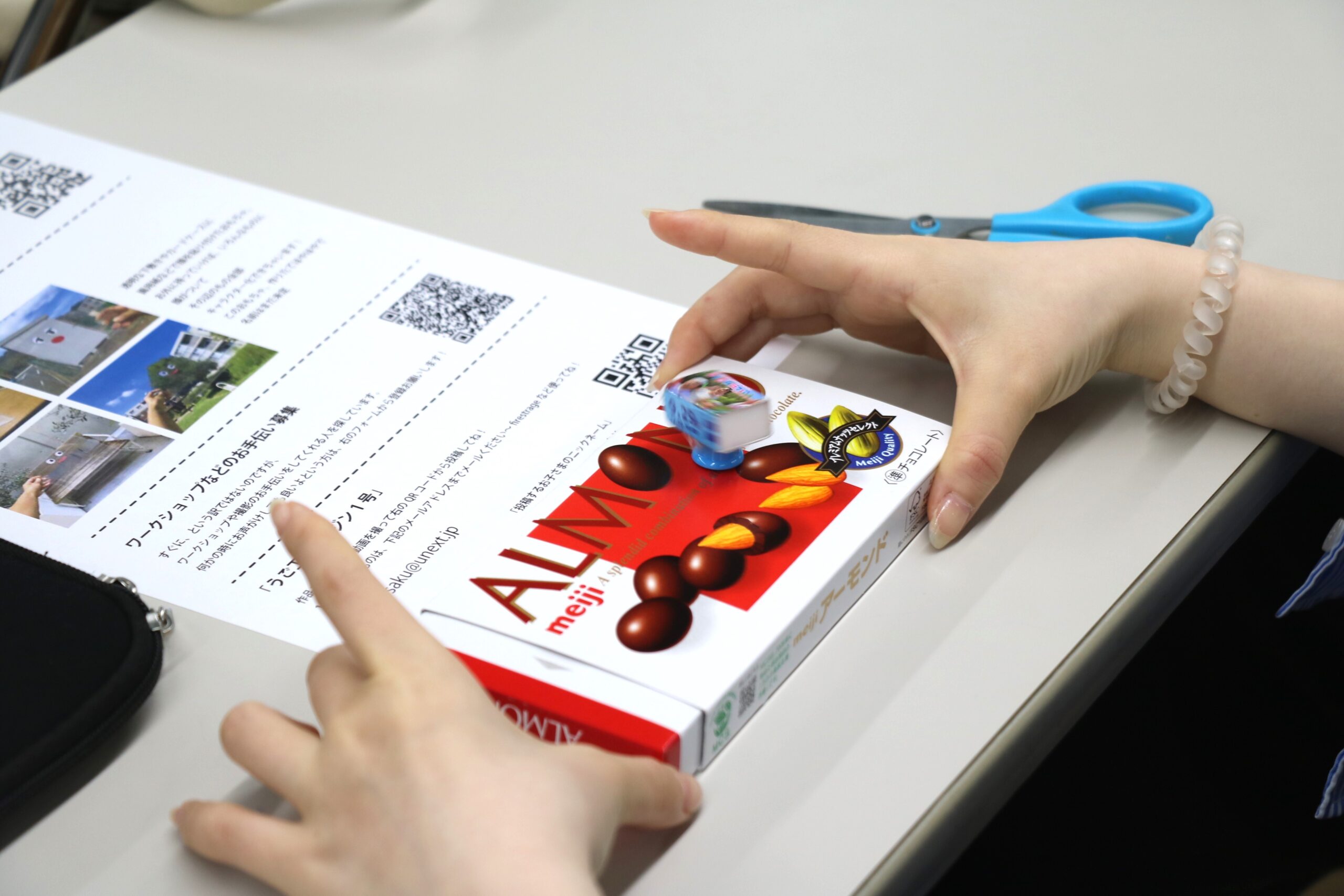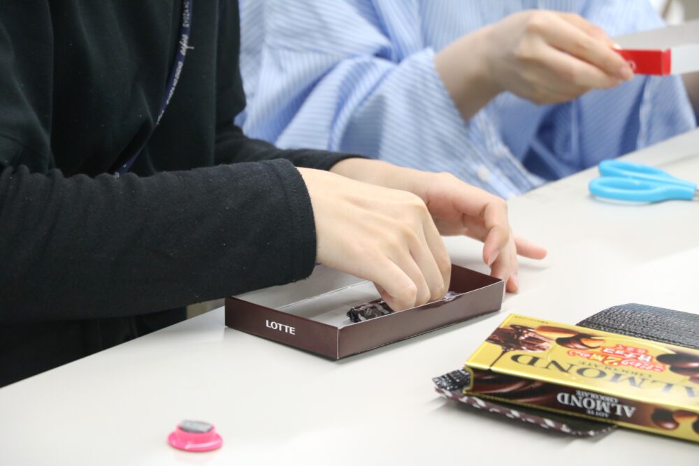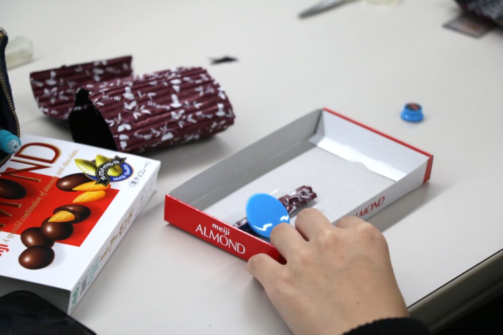 材料は、スライド式のアーモンドチョコレートの箱、磁石、折り紙です👀