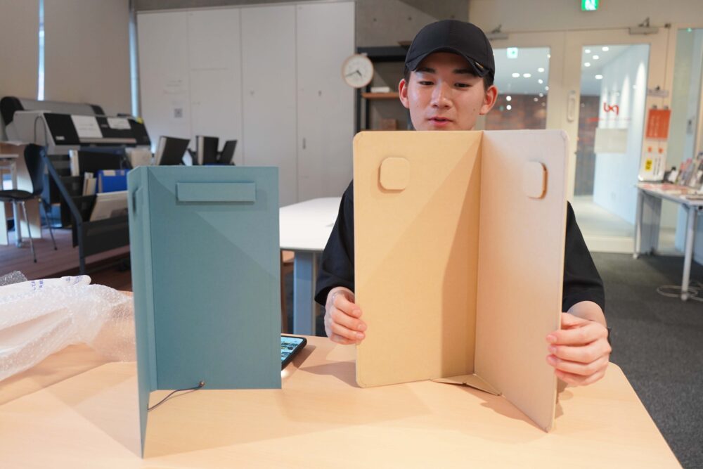 最終プレゼンは&PAPERSさんの社長や会長の前で行いました。 「我々は『箱』の工房なので、箱には面が揃っているという固定概念があったけれど、面を無くすという考えはなかった」と、アイデアの根幹である「引き算」の部分をすごく評価していただけたのが印象的でした。