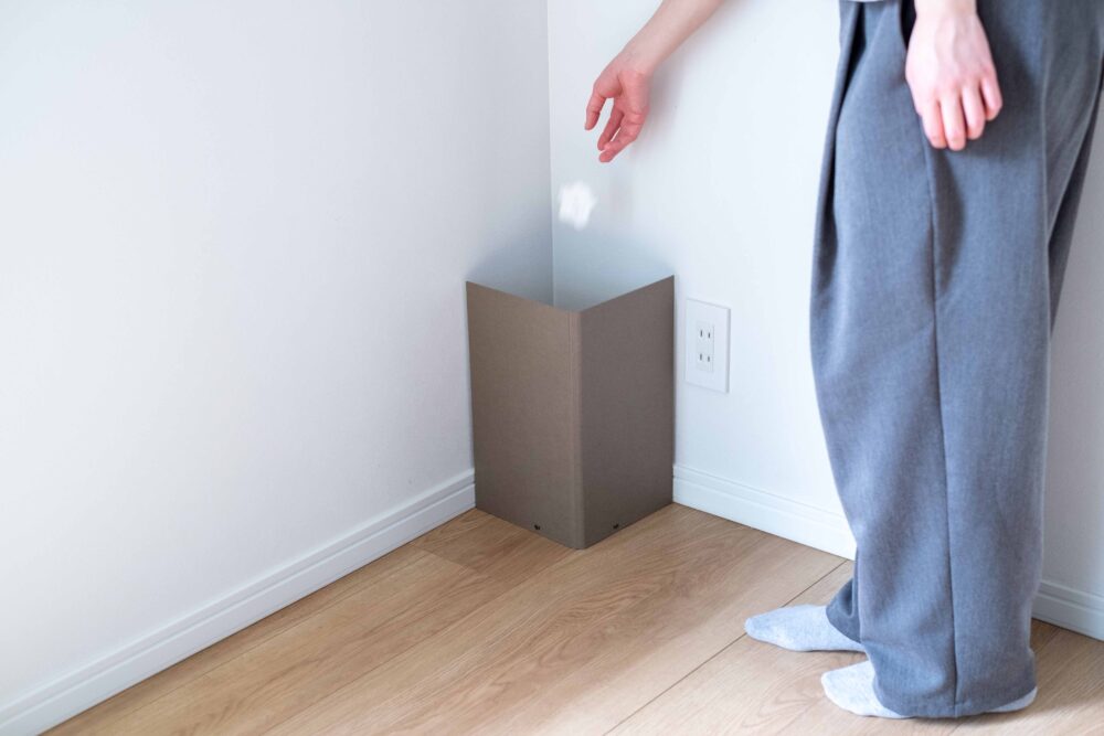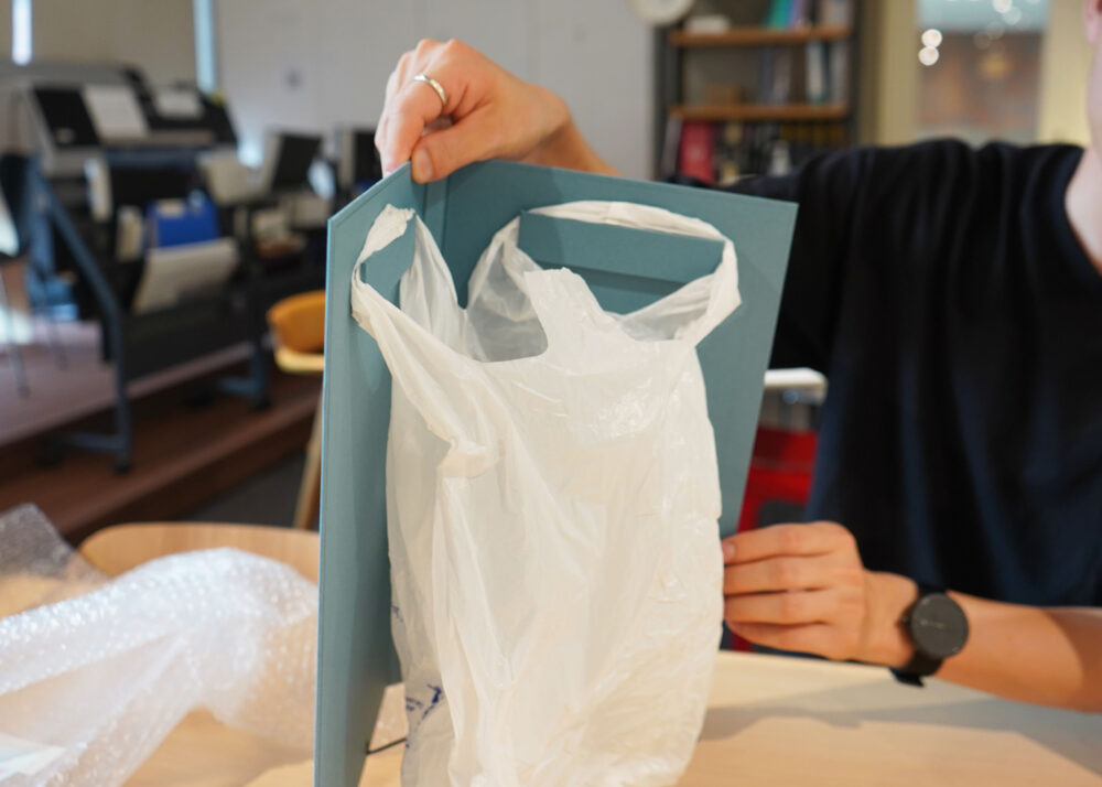 以前のデザインだと袋がたゆんでしまったんですが、改良したことで袋の口がピーンと張って安定し、ゴミが入れやすくなりました。 袋が床につくのも防げて、使う厚紙が短くなって生産性の向上にも繋がっています。
