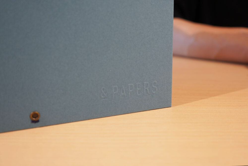 そこで、開きすぎを防ぐストッパーを複雑な紙の構造から皮紐のようなパーツに変えたり、角の処理を簡略化したり。 一枚の大きな厚紙から何枚取れるかも価格に影響するので、最適なサイズ検討も行いました。