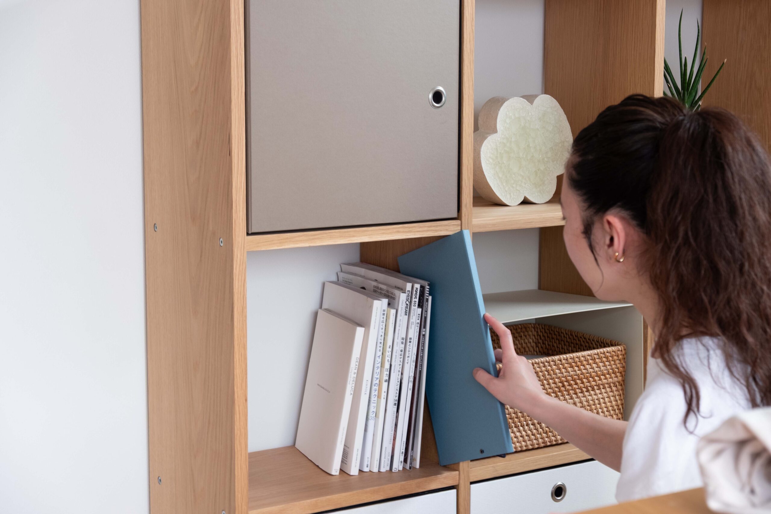 ブラック、クリアホワイト、トープ(くすんだ茶色)は定番カラーとしてまず決まりました。 残りのスモーキーブルーとパーシモン(柿のようなオレンジ色)の2色は、&PAPERSさんの「FLAP」という既存の看板商品(無印良品さんの棚に蓋をつける商品)を使っている空間に、このTUCKが置かれても色的に違和感がないように想定して選んでいます。