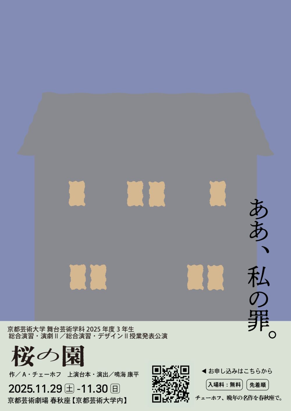 瓜生山キャンパスにある劇場「春秋座」にて、3年生が演劇の授業発表公演を行います。